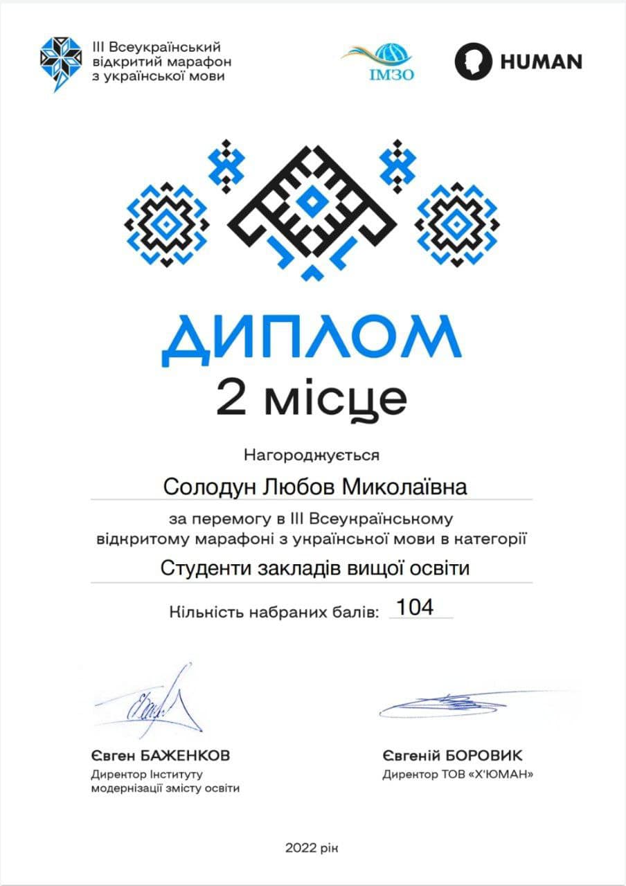 Вітаємо Любов Солодун з перемогою в ІІІ Всеукраїнському відкритому марафоні з української мови й отриманням диплому за ІІ місце!