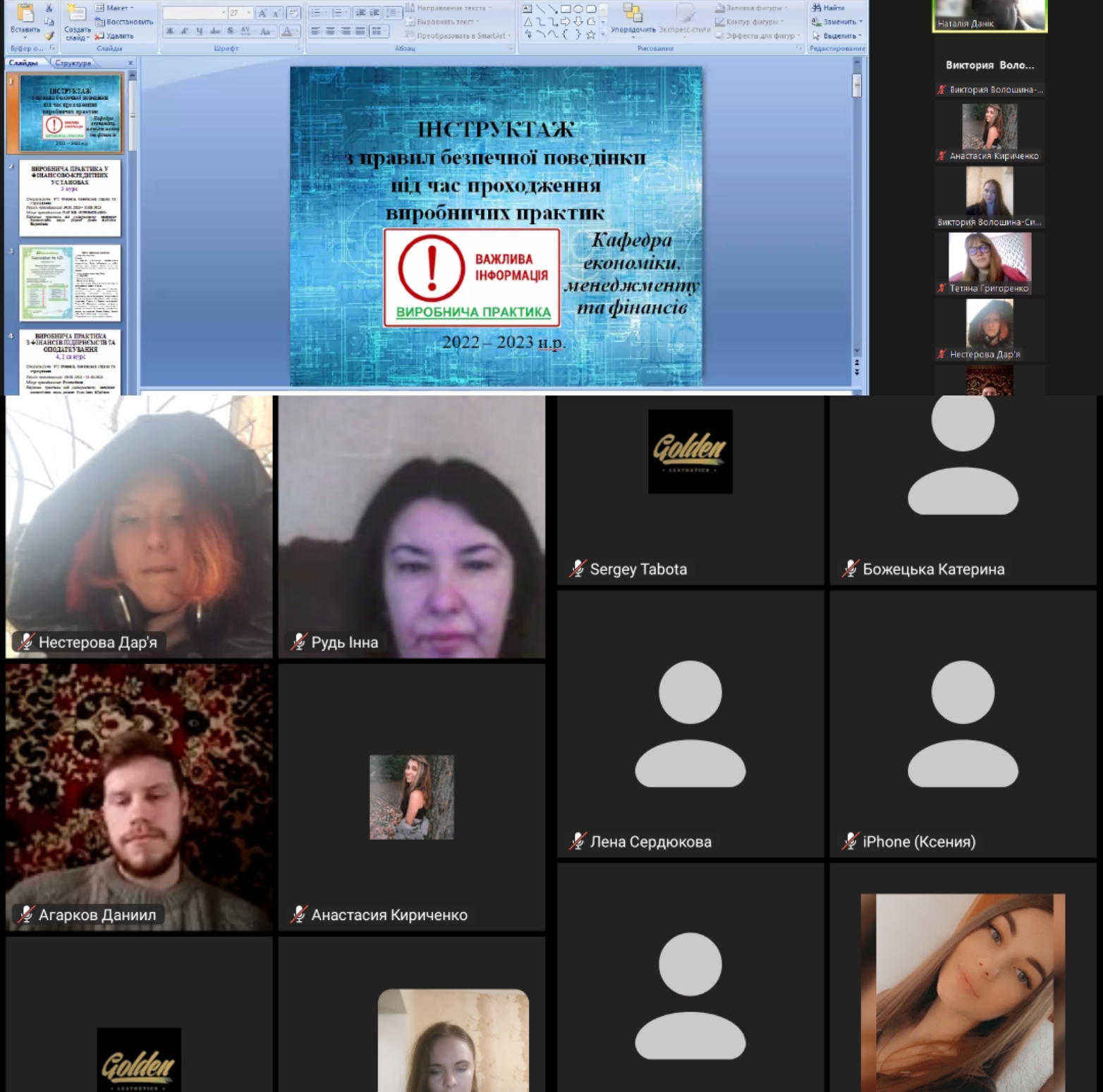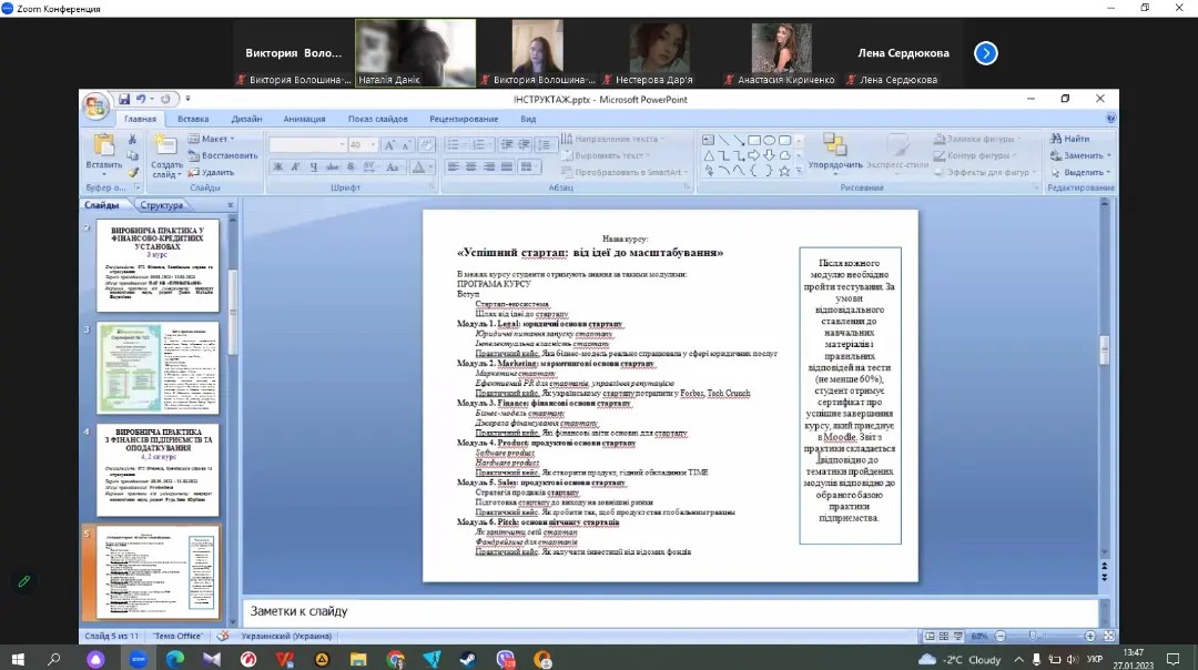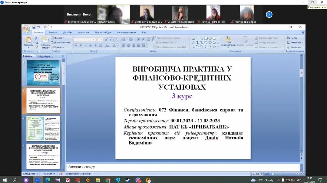 30 січня 2023 року почався період проходження виробничої практики студентів ІІІ та ІV курсів спеціальності 072 «Фінанси, банківська справа та страхування» та стажування за фахом у студентів V курсу спеціальності 072 «Фінанси, банківська справа та страхування», 073 «Менеджмент» та 051 «Економіка». Напередодні практики керівники від університету Н. В. Данік, І. Ю. Рудь та В. В. Волошина-Сідей провели інструктаж, окреслили коло завдань, які повинні виконати студенти, надали рекомендації по написанню звіту. Студенти мали змогу задати питання, які їх цікавили та отримали вичерпні відповіді.