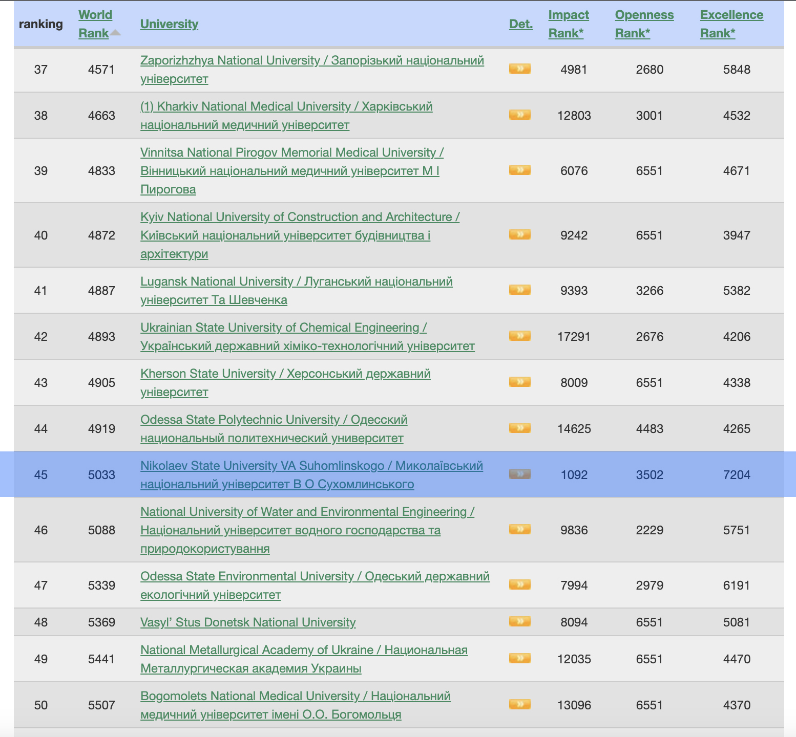 Миколаївський національний університет імені В. О. Сухомлинського вже декілька років поспіль лідирує серед закладів вищої освіти Миколаївщини, посідаючи 45 місце серед провідних українських закладів вищої освіти.