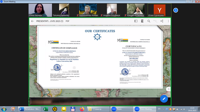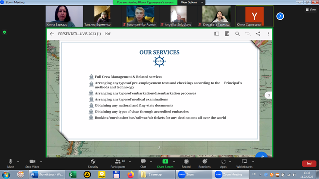 14 лютого 2023 року відбулася онлайн-зустріч студентів ІІІ-ІV курсів філологічного факультету Миколаївського національного університету імені В. О. Сухомлинскього (ОП «Переклад») з представником роботодавців, керівником Миколаївської філії міжнародної морської компанії «UVIS» Юлією Суровцевою.