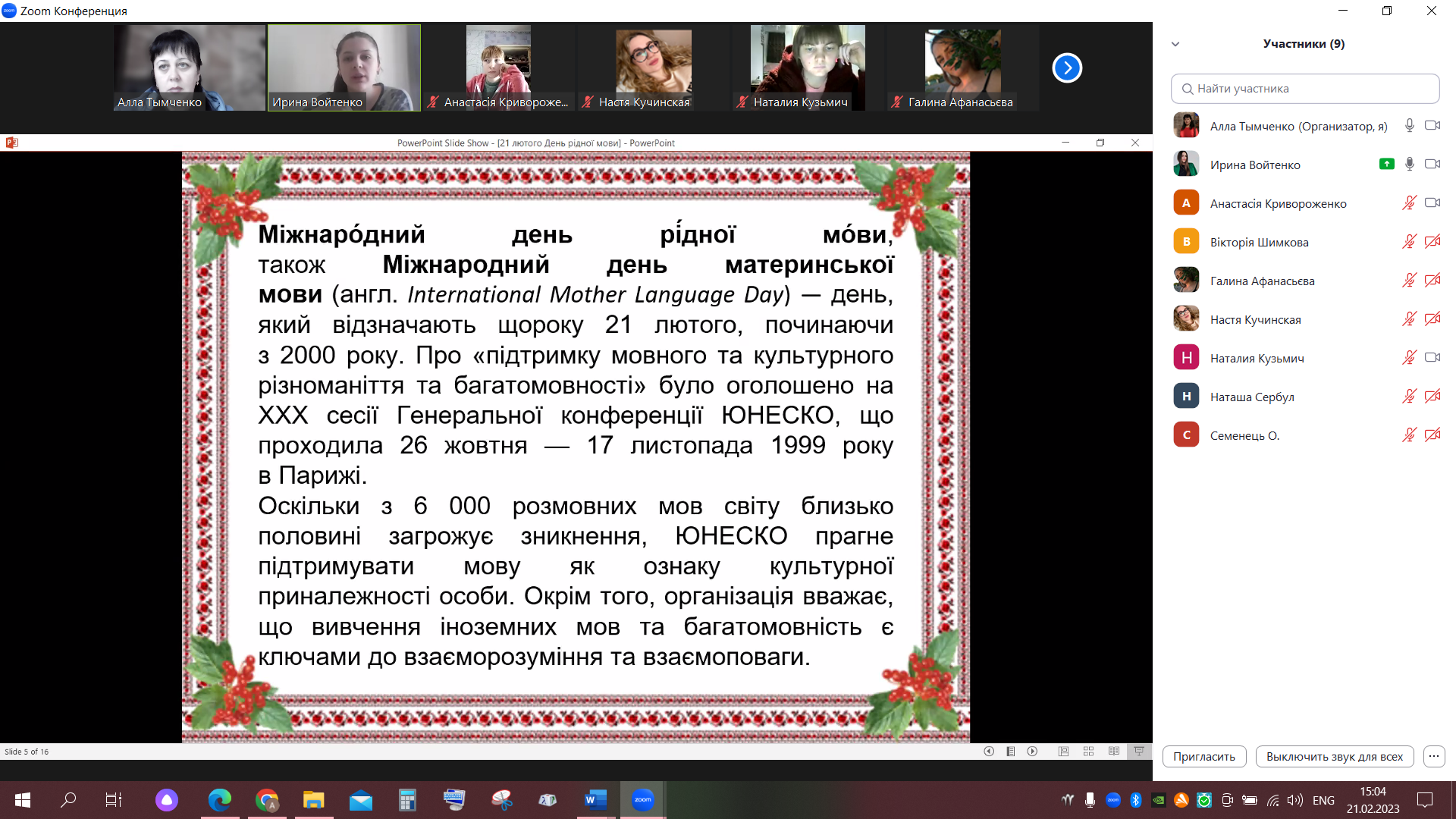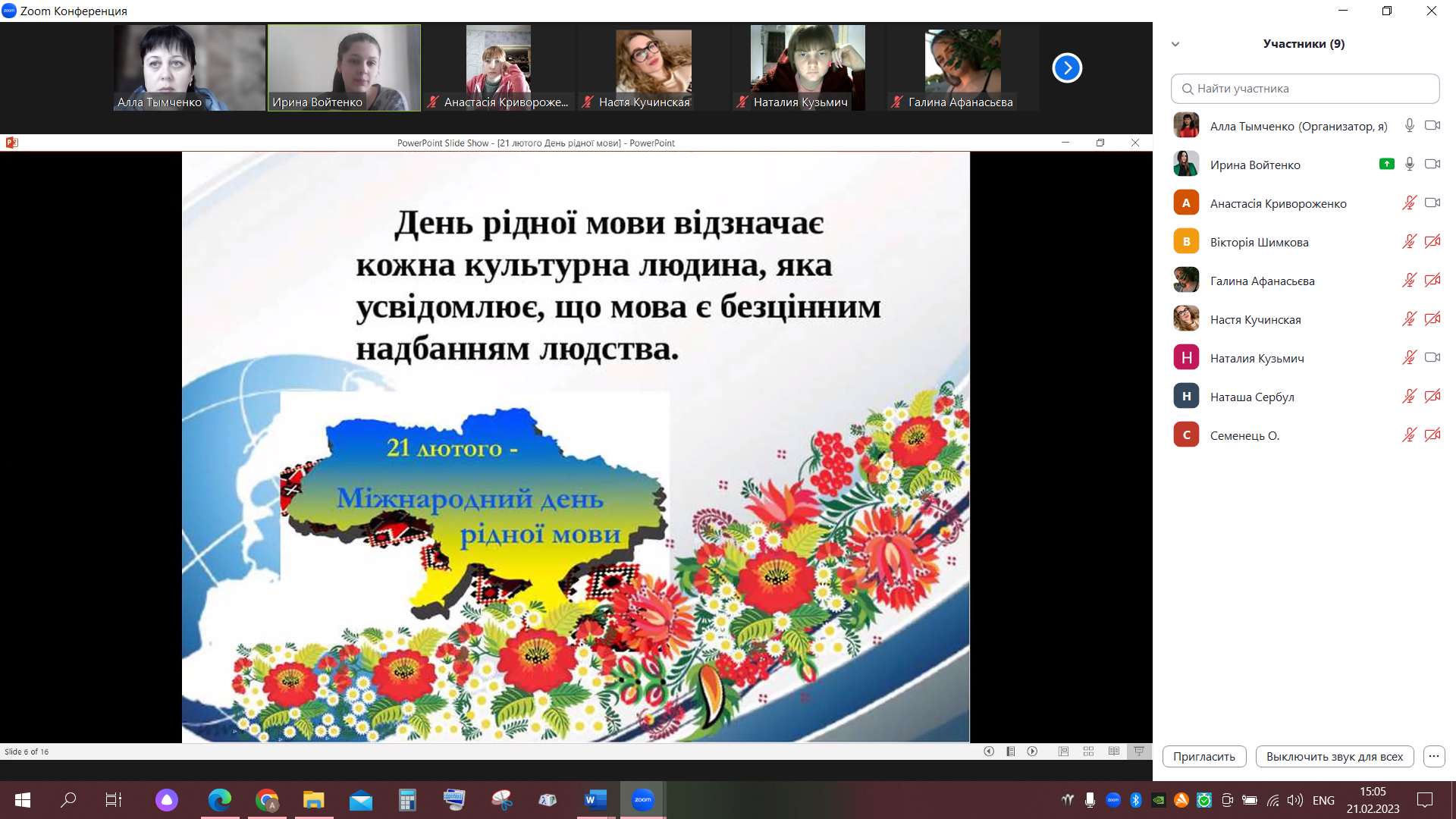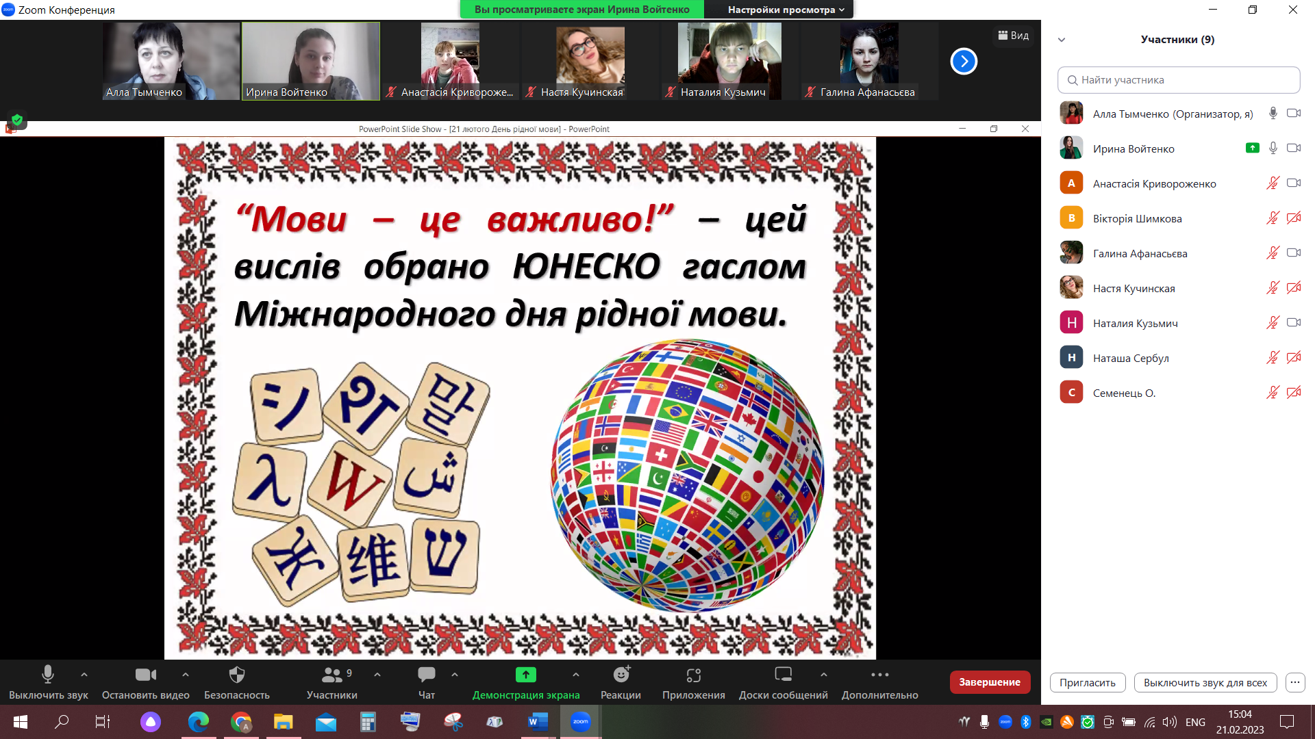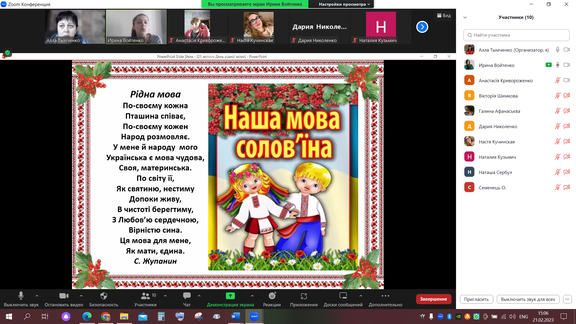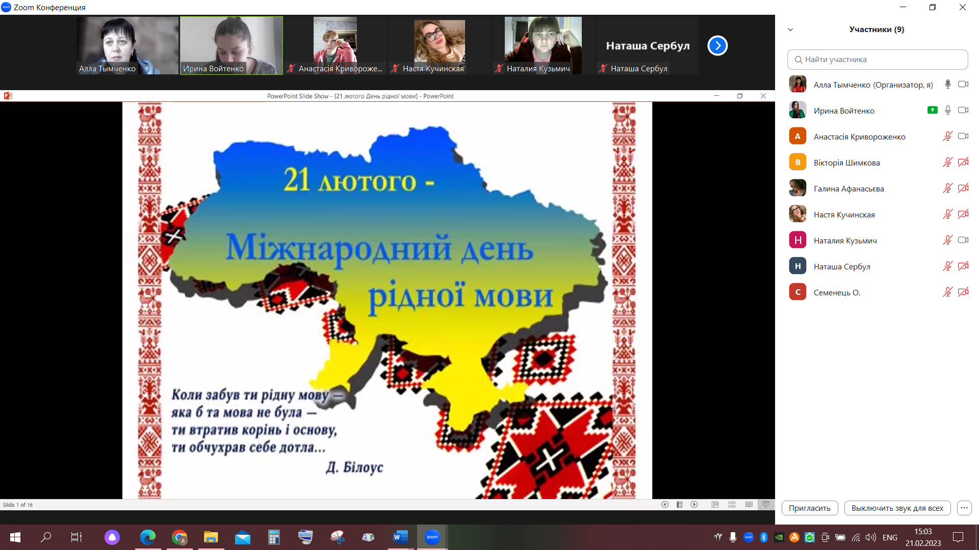 З цієї нагоди куратор А. А. Тимченко провела виховний захід для студентів 348 групи спеціальності «Початкова освіта» МНУ імені В. О. Сухомлинського на онлайн-платформі ZOOM. Гаслом зустрічі стала фраза: «Нас єднає МОВА».