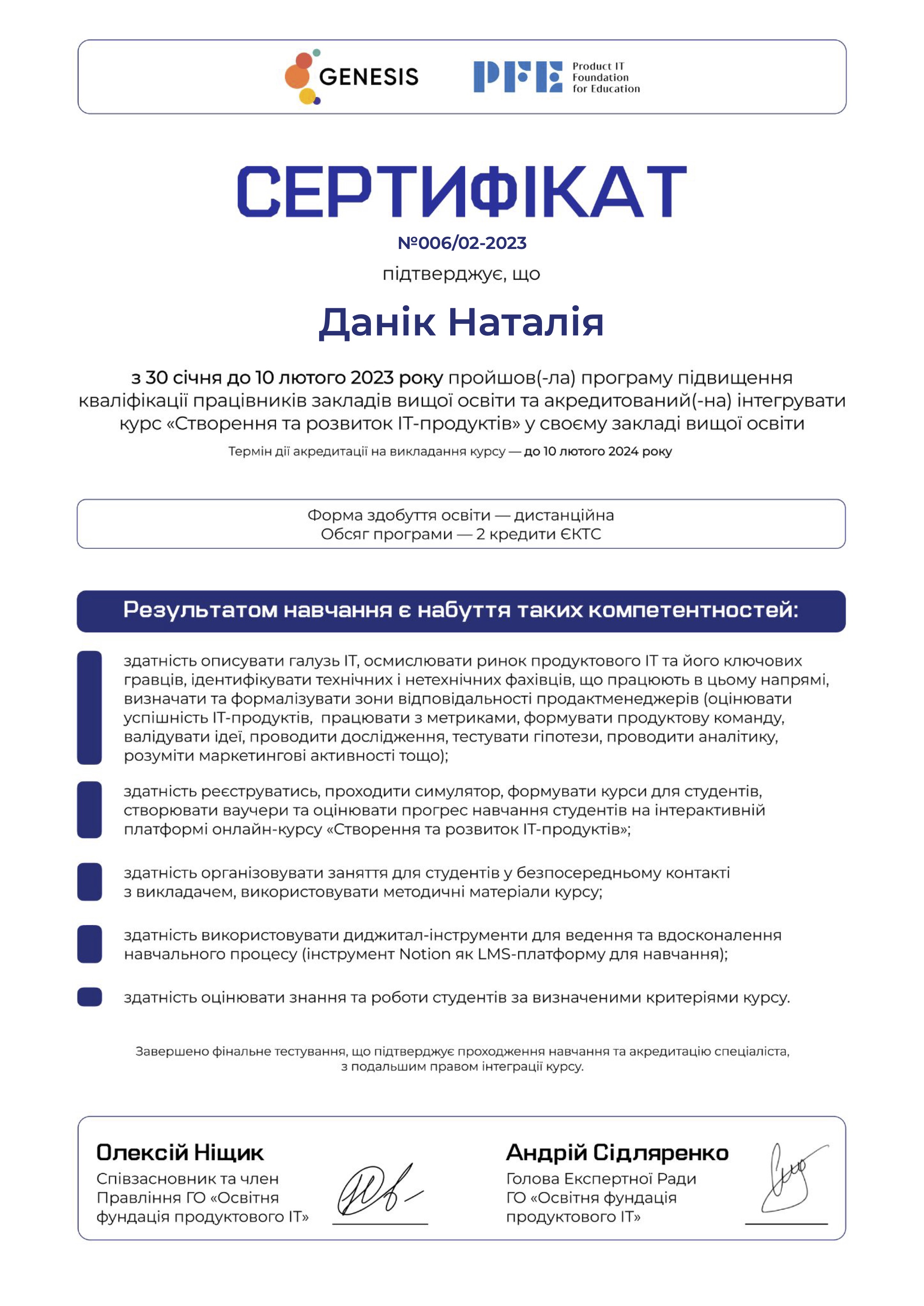 З 30 січня до 10 лютого 2023 року завідувач кафедри економіки, менеджменту та фінансів, доцент Наталія Данік пройшла програму підвищення кваліфікації працівників закладів вищої освіти (за ініціативи Product IT Foundation for Education, української кофаундингової ІТ-компанії «Genesis» за підтримки Міністерства освіти та науки України, Міністерства цифрової трансформації України). В результаті успішного проходження фінального тестування пані Наталія отримала акредитацію на інтеграцію онлайн-курсу «Створення та розвиток ІТ-продуктів» у Миколаївському національному університеті імені В. О. Сухомлинського (сертифікат №006/02-2023 від 10.02.2023 р.).