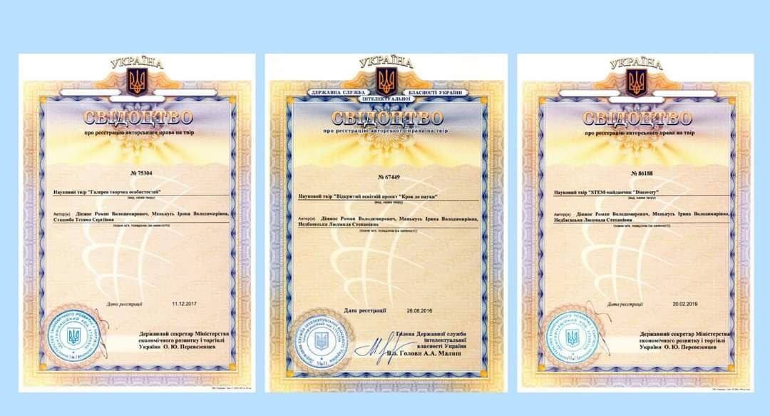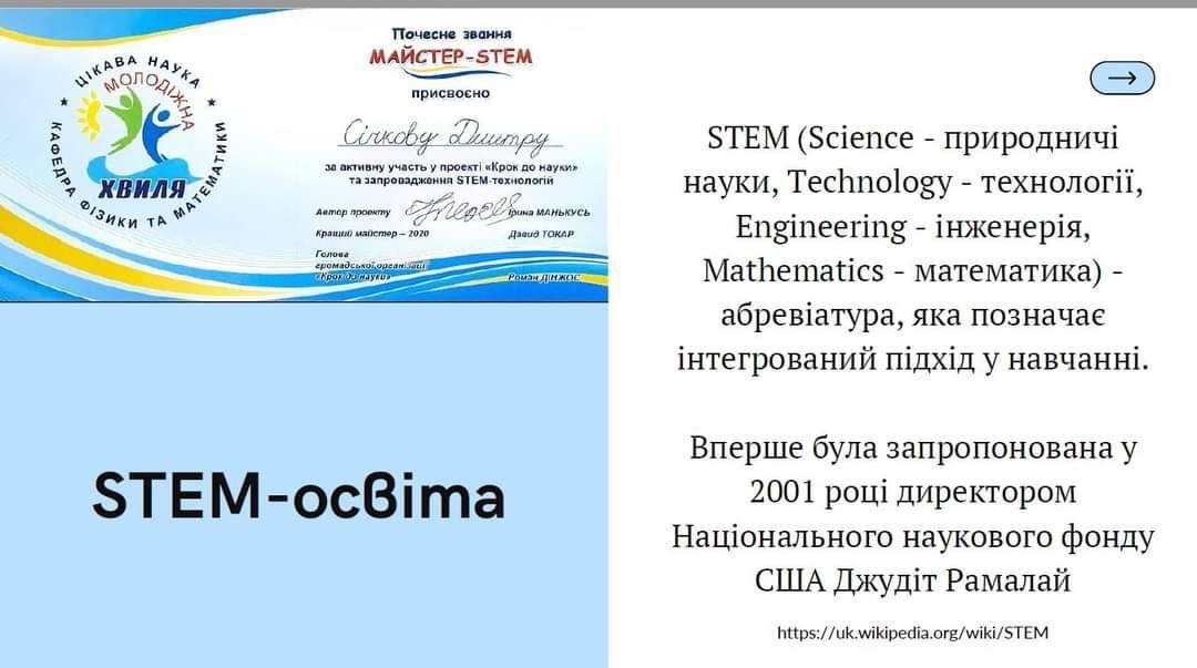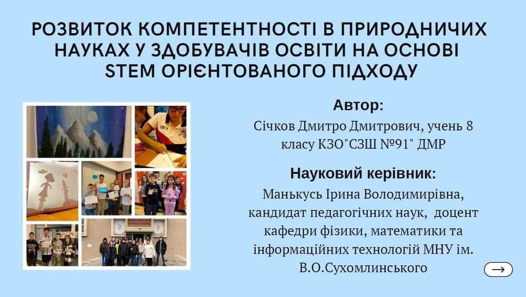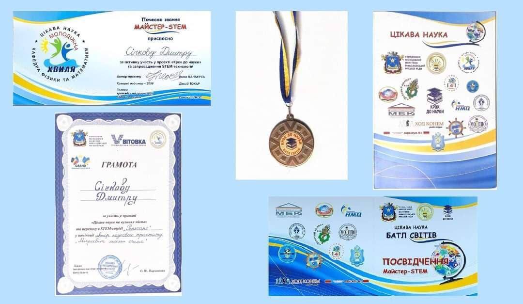 Юний науковець захистив свою роботу «Розвиток компетентності в природничих науках у здобувачів освіти на основі STEM-орієнтованого підходу» на базі Авторської Української школи GRAND (м. Бухарест) під керівництвом кандидата педагогічних наук, доцента Манькусь Ірини Володимирівни.