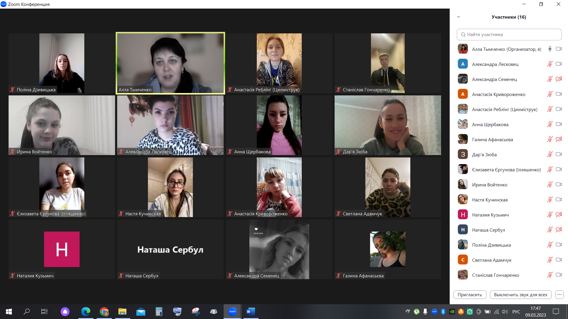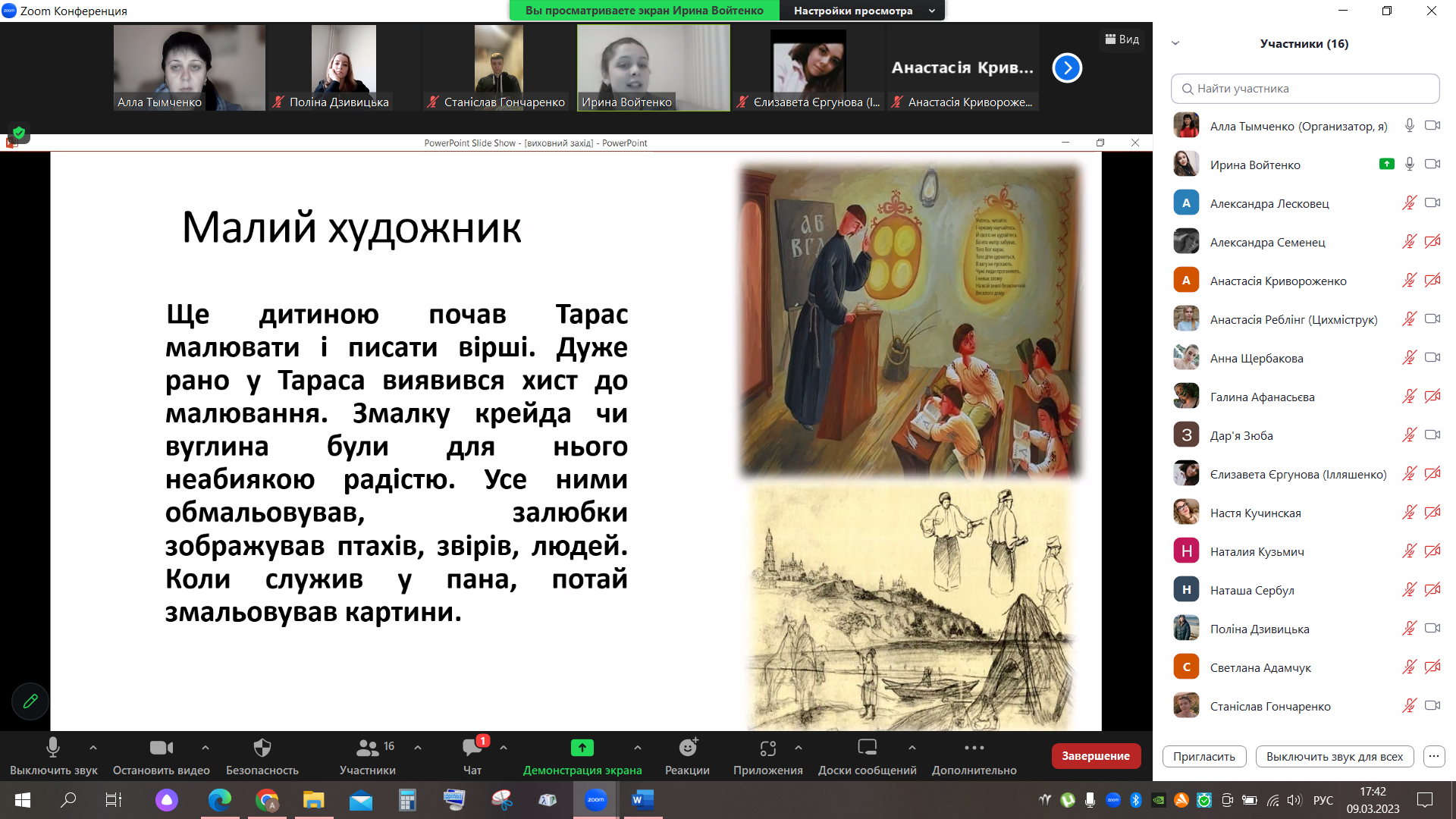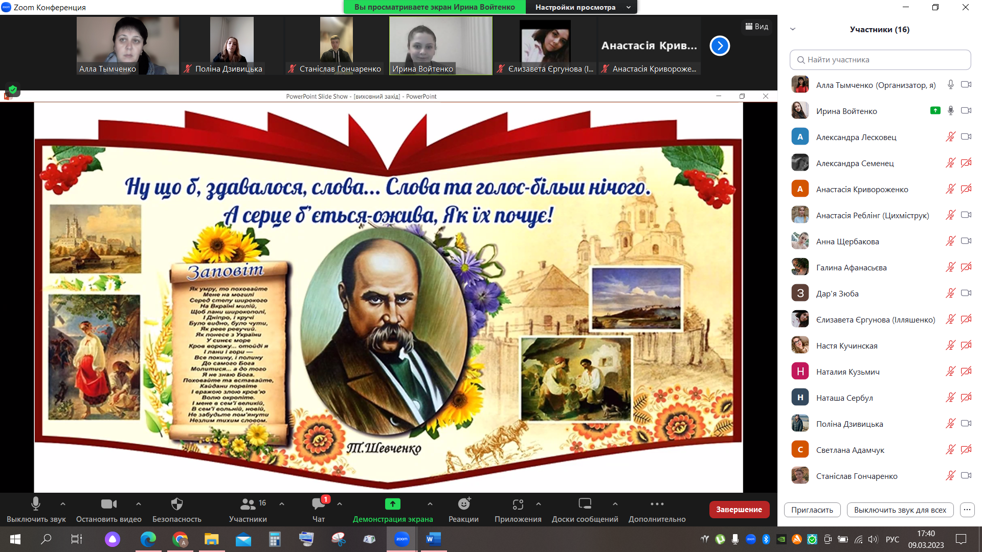 Саме тому 9 березня 2023 р. у річницю дня народження великого Кобзаря студенти 348 групи спеціальності 013 «Початкова освіта» разом з куратором А. А. Тимченко вшанували пам’ять Т. Г. Шевченка, провівши виховний захід «Кобзарева струна не вмирає». Було згадано складну біографію видатного українського поета, художника; розглянуто його найвідоміші картини («Катерина», «У степах Арала», «Циганка ворожить», «Гористий берег острова Миколая» та інші), пролунали відомі вірші, уривки з поем, цитати.
