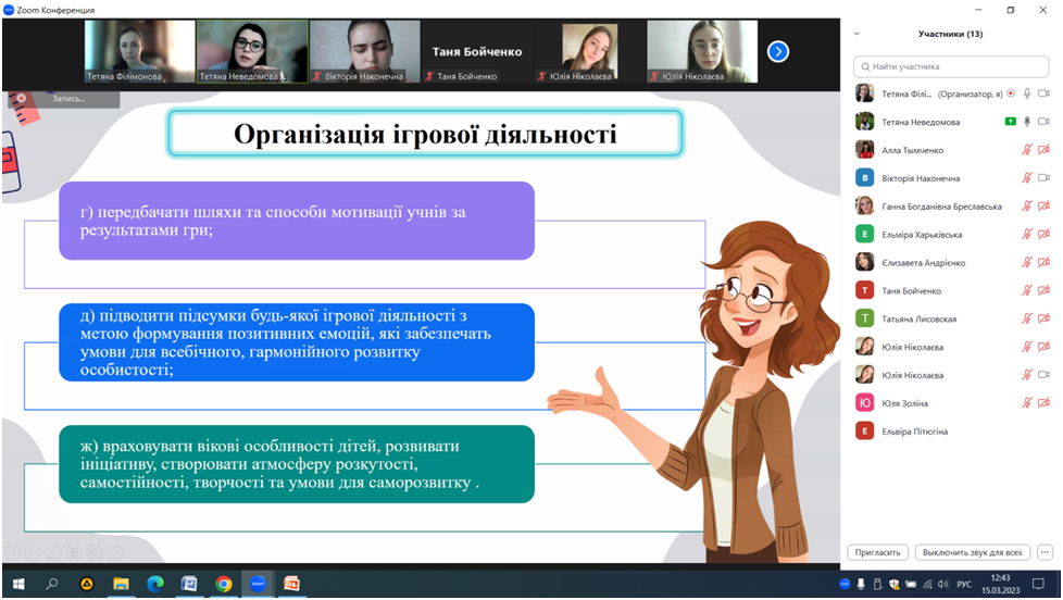 15 березня 2023 року кандидат педагогічних наук, старший викладач кафедри початкової та дошкільної освіти Т. В. Філімонова провела відкрите практичне заняття з дисципліни «Методика навчання інтегрованого курсу «Я досліджую світ» у початковій школі» зі студентами 448 групи спеціальності 013 «Початкова освіта» на тему: «Ігрова діяльності на уроці «Я досліджую світ»: особливості організації та ризики».