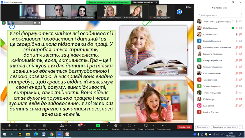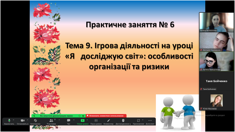 У ході спільної роботи студенти розкрили значення гри у житті дитини, визначили сутність, завдання та функції гри, пригадали класифікацію ігор, розкрили специфіку використання дидактичних ігор на уроках інтегрованого курсу «Я досліджую світ», провели аналіз підручників з інтегрованого курсу «Я досліджую світ» на предмет залучення дітей в ігрову діяльність.