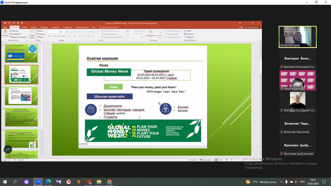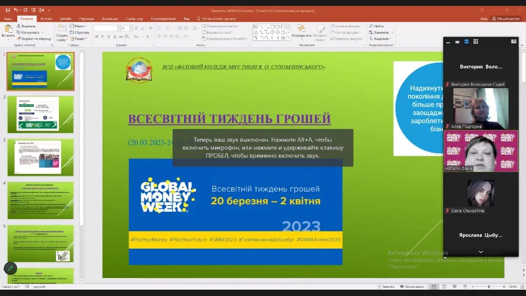 20 березня 2023 року викладачі кафедри економіки менеджменту та фінансів Н. В. Данік та В. В. Волошина-Сідей разом з викладачем ВСП «Фаховий коледж МНУ імені В. О. Сухомлинського» А. О. Подгорною провели перший онлайн-захід у межах запланованої кампанії до Всесвітнього тижня грошей.