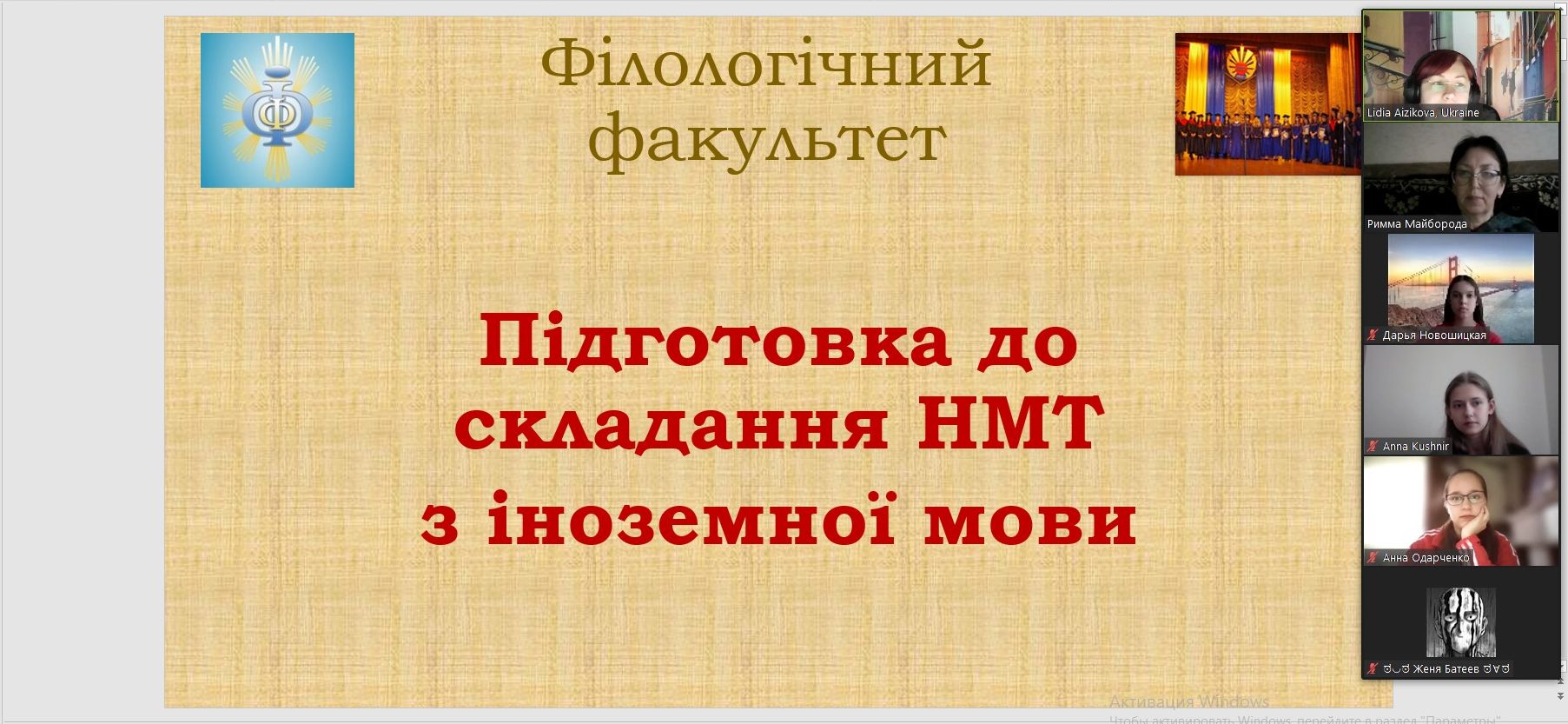 17 березня 2023 року викладачі кафедри германської філології Л. В. Айзікова, О. Є. Дем’яненко, Р. В. Майборода та Д. В. Пустовойченко провели онлайн-семінар із підготовки учнів старших класів до складання національного мультипредметного тесту з іноземної мови. Організатори приділили увагу всім аспектам підготовки. Перш за все, важливо вчасно зареєструватися і зрозуміти, як буде проходити оцінювання. Оцінюється, насамперед, володіння лексикою і граматикою англійської мови. Всього в блоці тестів англійської мови абітурієнти повинні виконати 32 завдання.