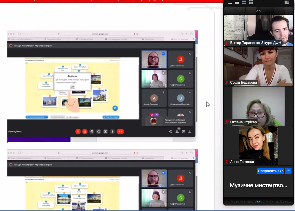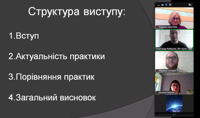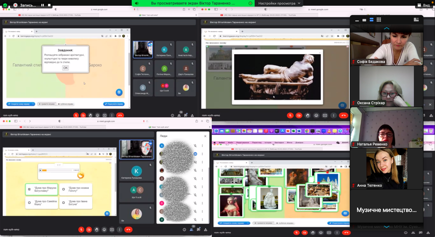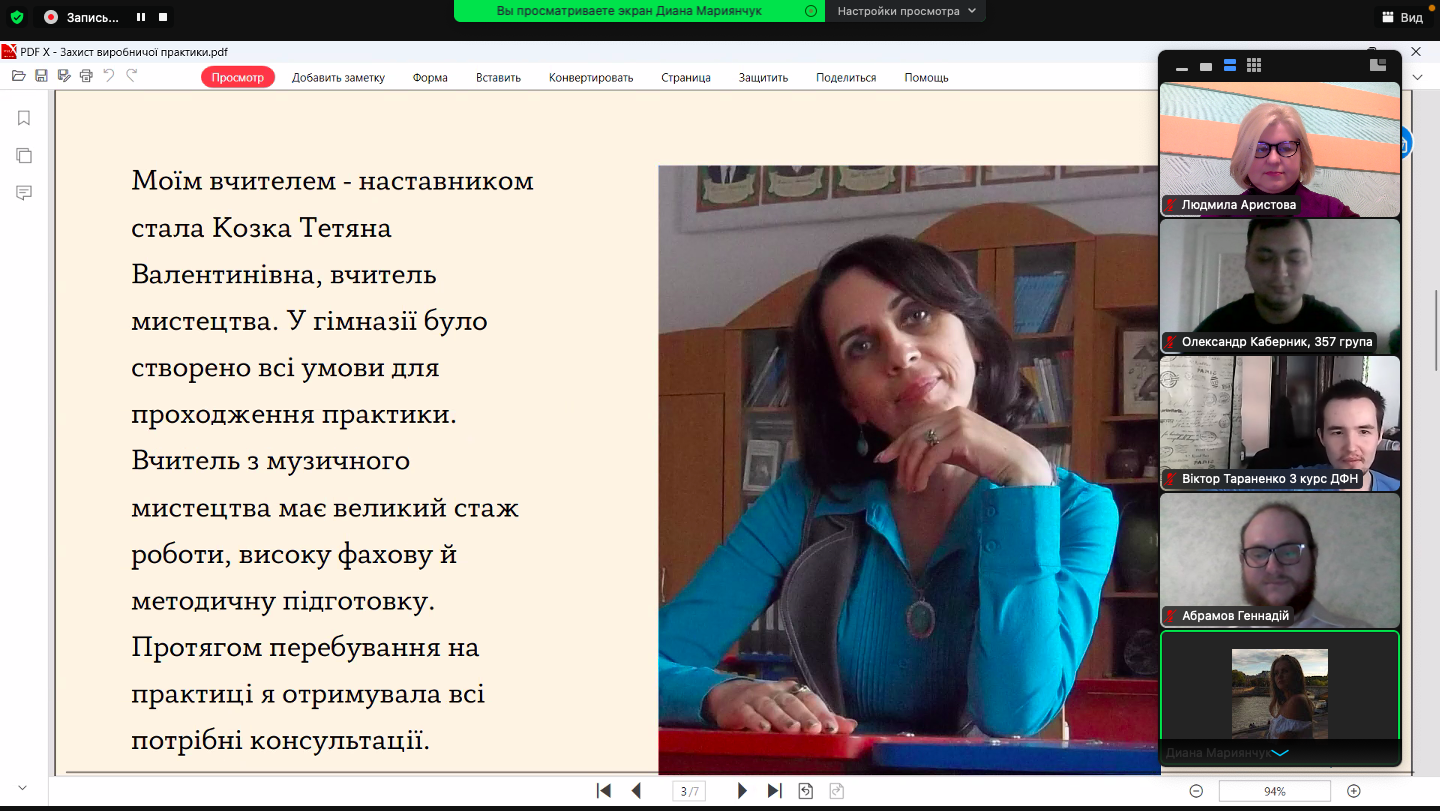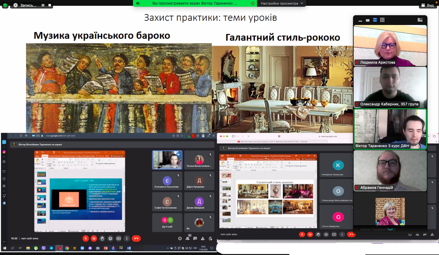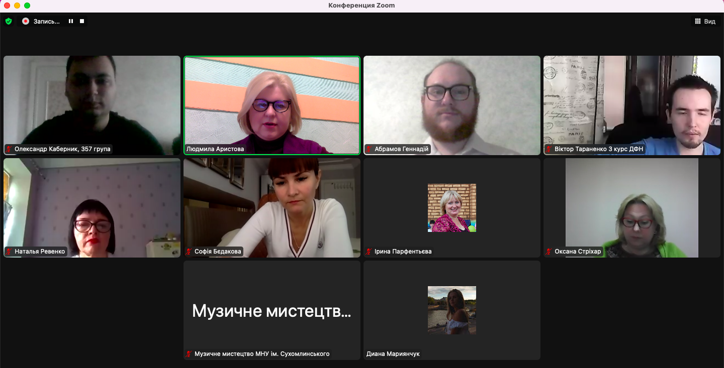 21 березня 2023 року відбулась підсумкова конференція з виробничої педагогічної практики здобувачів вищої освіти ІІІ курсу спеціальності «Середня освіта (Музичне мистецтво)». Практика проходила у Миколаївському ліцеї імені М. Аркаса за дистанційною формою. Під час конференції студенти із захопленням поділились з викладачами кафедри музичного мистецтва, які входили до комісії, про свої здобутки, проведенні уроки, спілкування з учнями і ученицями 8-11 класів ліцею, а ткож про наставницю в ліцеї, вчителя-методиста, вчителя вищої категорії Т. В. Козку, яка допомагала їм на шляху подолання педагогічних труднощів.