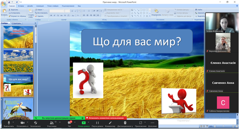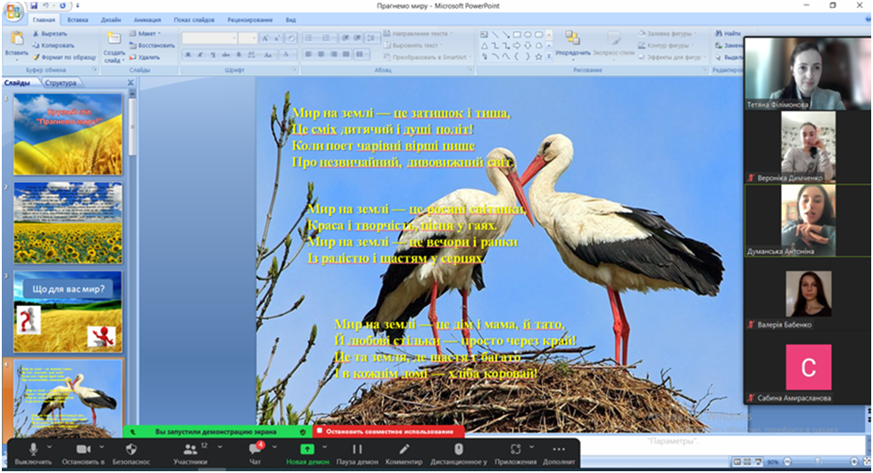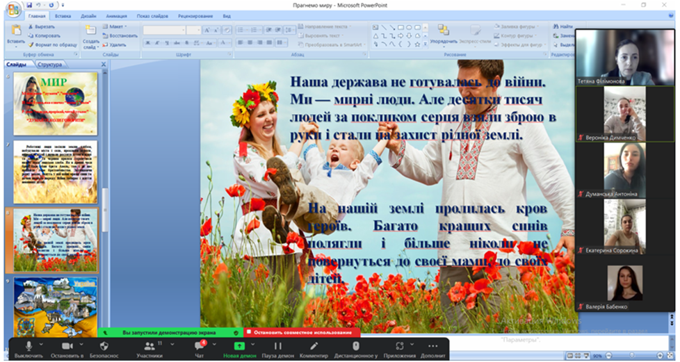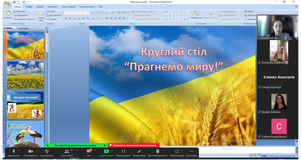 24 березня 2023 року кандидат педагогічних наук, старший викладач кафедри початкової та дошкільної освіти Т. В. Філімонова зі студентами І курсу спеціальності 013 «Початкова освіта» провели круглий стіл «Прагнемо миру!».