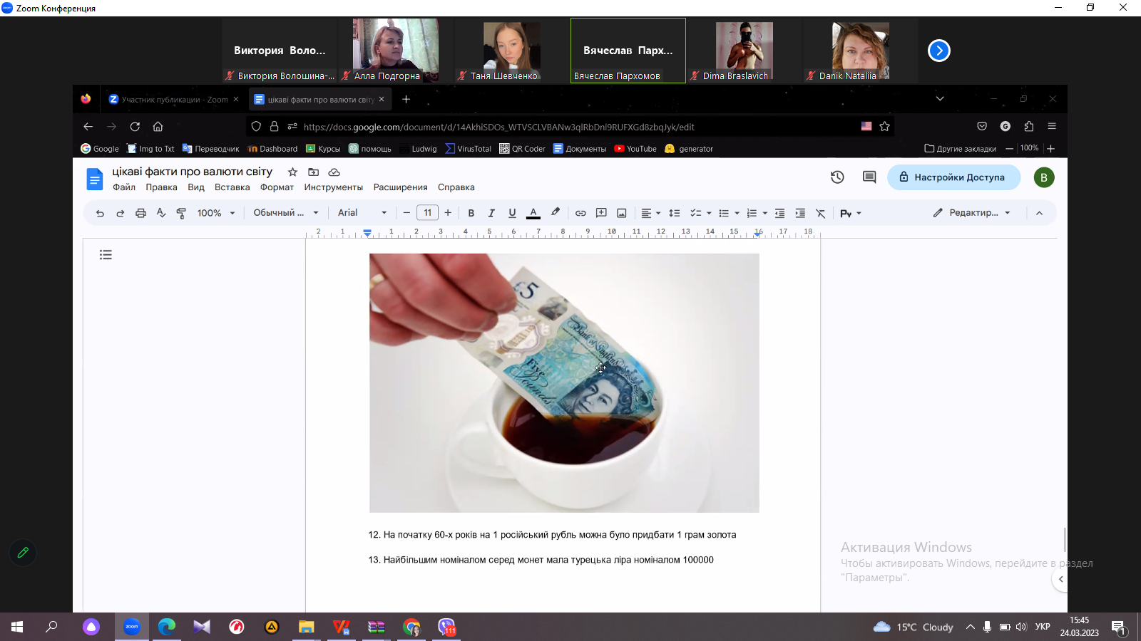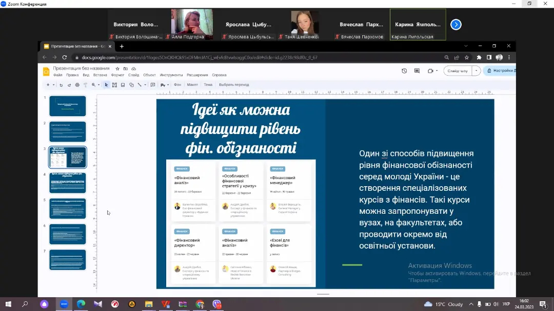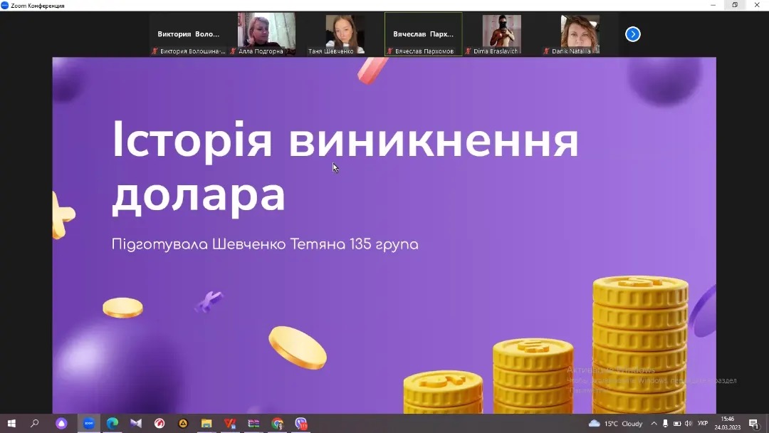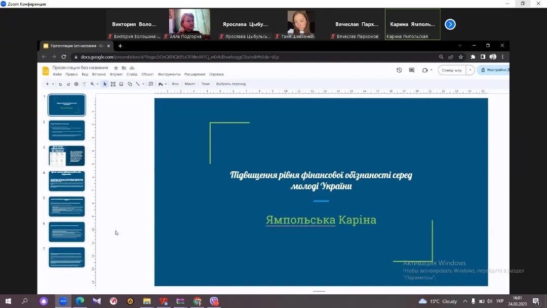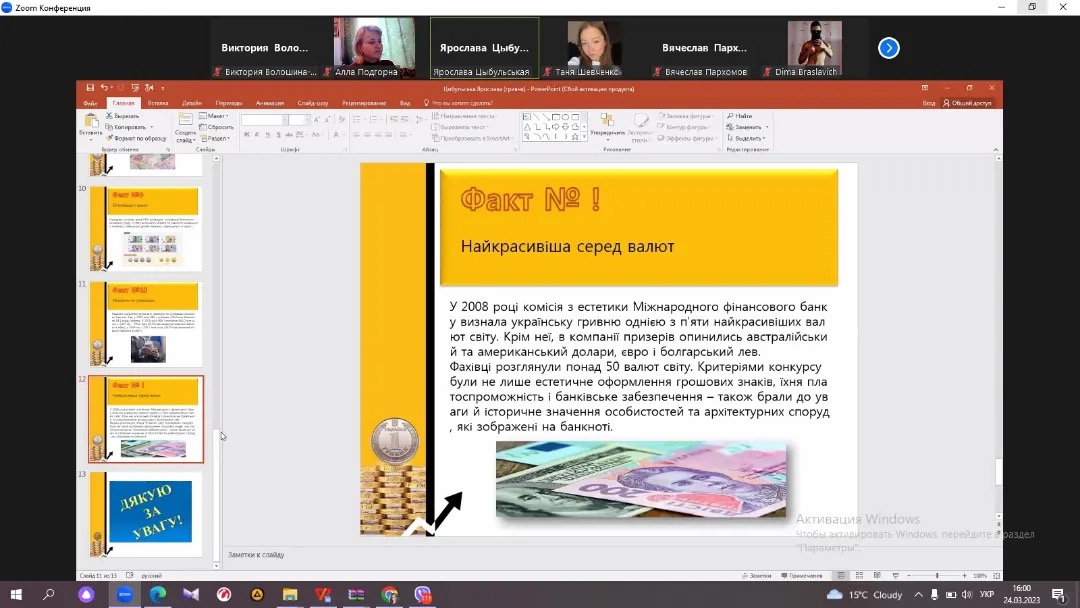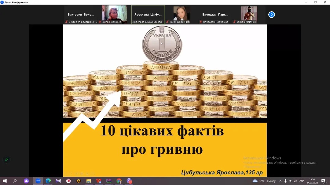 Викладачі кафедри економіки, менеджменту та фінансів Н. В. Данік, В. В. Волошина-Сідей та викладач ВСП «Фаховий коледж МНУ імені В. О. Сухомлинського» А. О. Подгорна провели захід в межах GMW, що стосується захисту конкурсних робіт студентів: «Цікаві факти про гроші» та «Ідеї покращення фінансової грамотності молоді». Серед робіт наданих до конкурсу відмітили роботи наступних студентів: Ямпольської Каріни, Цибульської Ярослави, Шевченко Тетяни та Пархомова В’ячеслава. Після захисту робіт було проведено Kahoot -гру з питань фінансової грамотності, що були опрацьовані під час різнопланових заходів цього тижня GMW. Переможцем гри стала Цибульська Ярослава. Захід пройшов у цікавому форматі, студенти приймали активну участь, продемонстрували обізнаність та неабияку зацікавленість фінансовою тематикою.