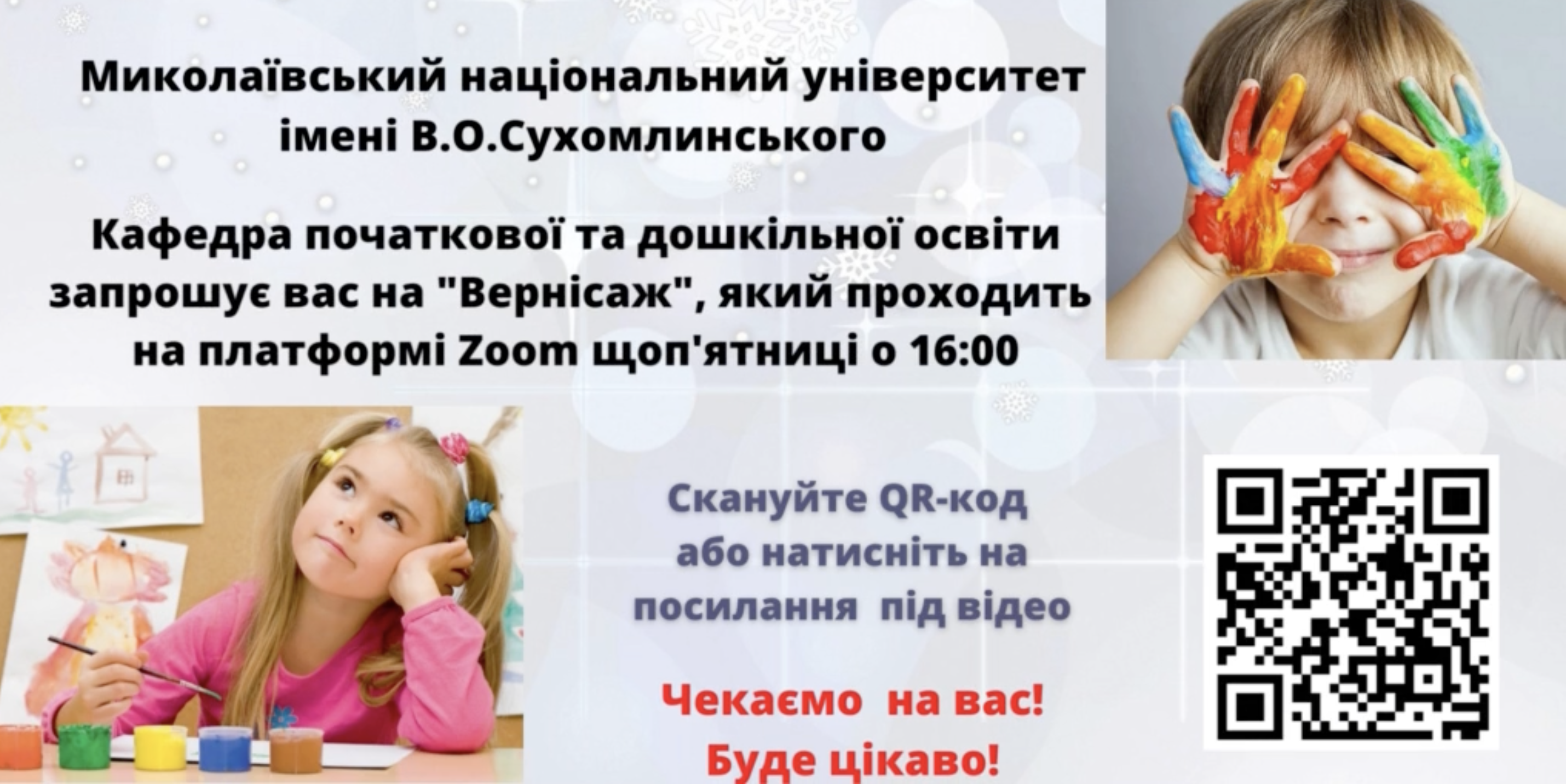 Щоп’ятниці на кафедрі початкової та дошкільної освіти за ініціативою студентів і викладачів спеціальності 012 “Дошкільна освіта” проходить онлайн-захід «Вернісаж». Мета заходу – формування основ культури, естетичного сприймання та емоційного ставлення до прекрасного, духовне збагачення студентів, розширення їх світогляду, оволодіння цінностями та знаннями в галузі образотворчого мистецтва. Малювання в поєднанні з арт-терапією є частиною символічної системи комунікації, котра включає мову, читання й письмо.