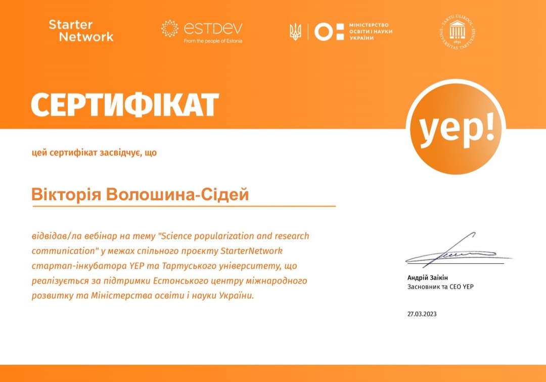 Викладач кафедри економіки, менеджменту та фінансів В. В. Волошина-Сідей взяла участь у вебінарі на тему: «Science popularization and research communication» у межах спільного проекту StarterNetwork стартап-інкубатора YEP та Тартуського університету, що реалізується за підтримки Естонського центру міжнародного розвитку та Міністерства освіти і науки України. Під час вебінару В. В. Волошина-Сідей покращила компетенції у сучасних аспектах впровадження стартапів, що будуть використовуватися під час викладання дисципліни «Інноваційне підприємництво та управління стартап проектами» у межах освітньої програми спеціальності 072 «Фінанси, банківська справа та страхування».