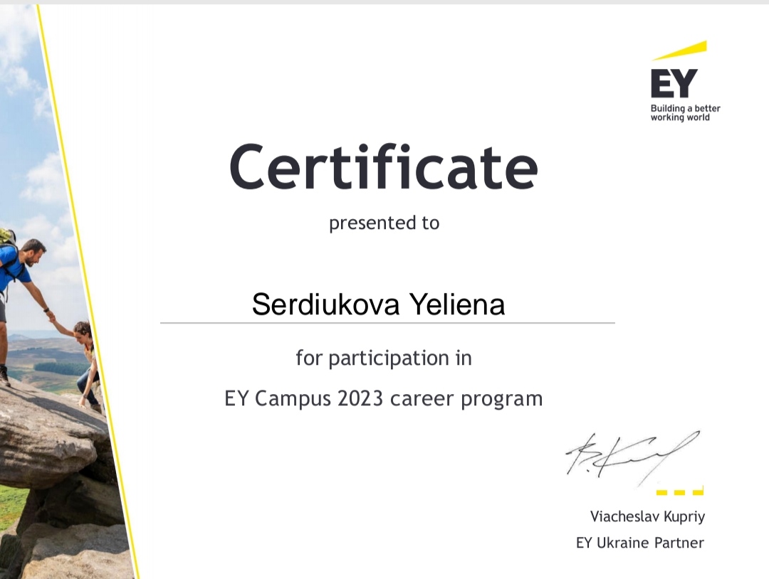 Сердюкова Олена, студентка ІІІ курсу спеціальності 072 «Фінанси, банківська справа та страхування» МНУ імені В. О. Сухомлинського, успішно завершила навчання за освітньою програмою від компанії Ernst&Young, що включала в себе кейси із аудиту, консалтингу, податково-юридичної діяльності та стратегій і угод. Під час навчання брала участь у суміжних вебінарах, спрямованих на розвиток soft-skills, розкриття інформації про ринок кар’єрних можливостей та корисні поради щодо складання резюме та працевлаштування. За результатами навчання отримала сертифікат про проходження курсу.