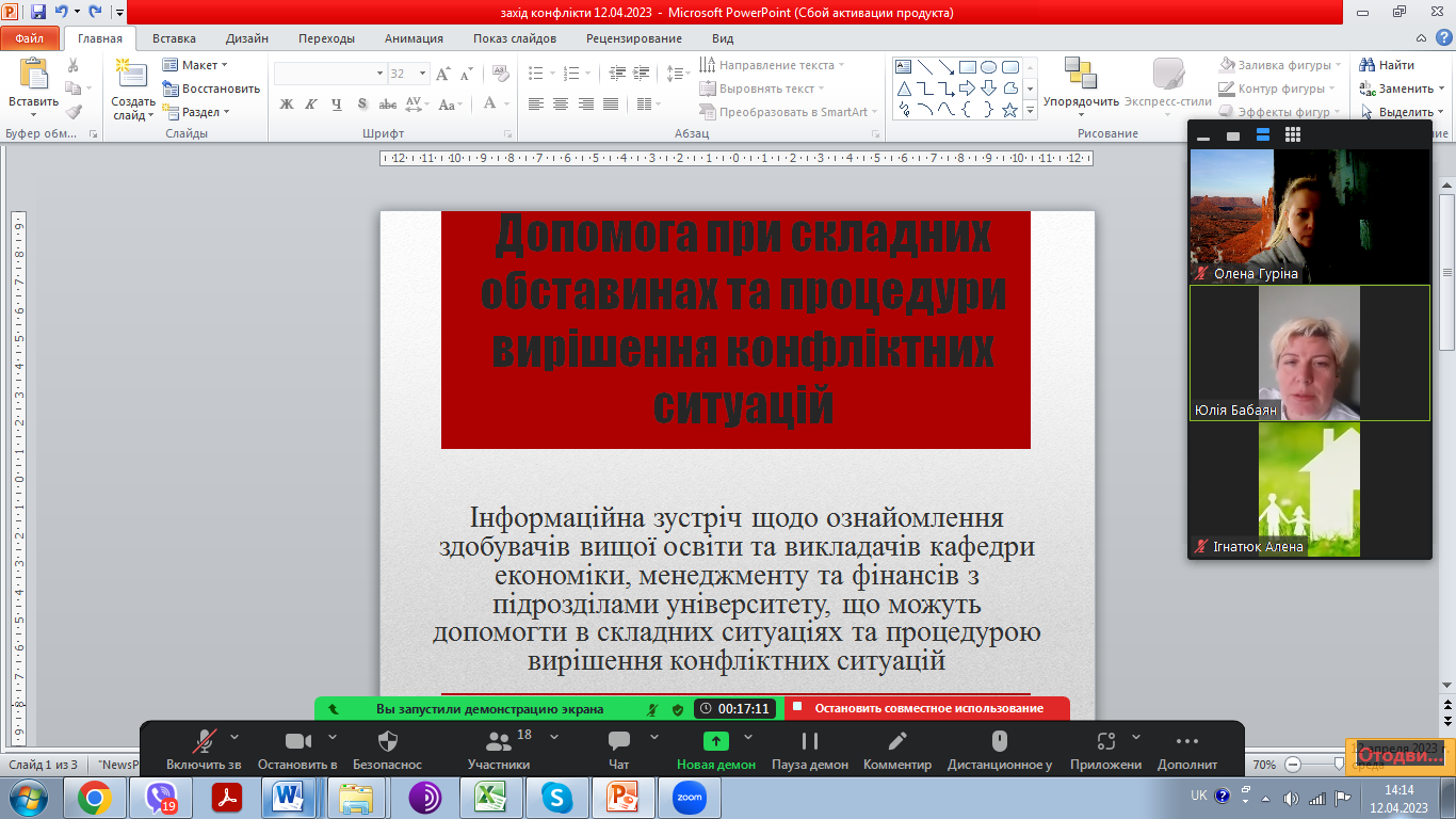 12 квітня 2023 року відбулась інформаційна зустріч із здобувачами освіти, викладачами кафедри економіки, менеджменту та фінансів, посадовими особами університету, відповідальними за вказані напрямки роботи. Тема : «Допомога при складних обставинах та процедури вирішення конфліктних ситуацій».