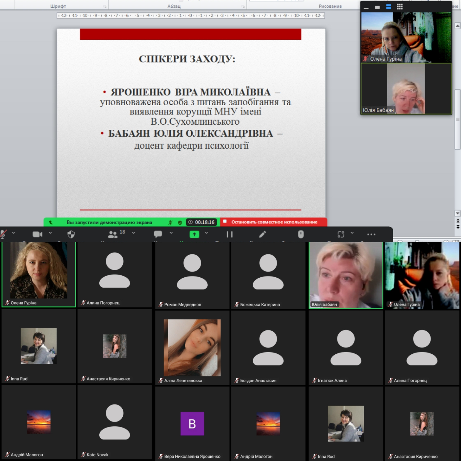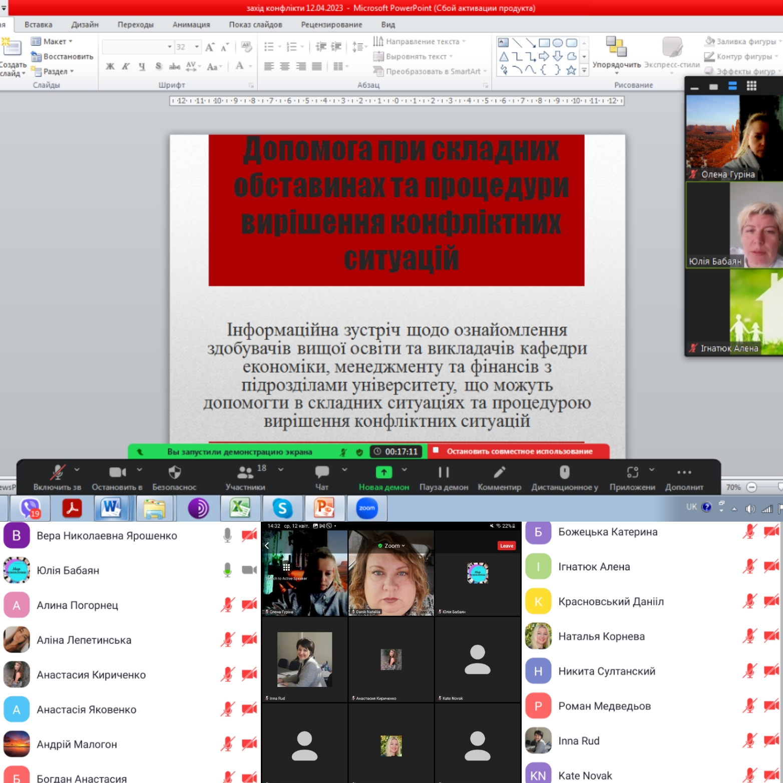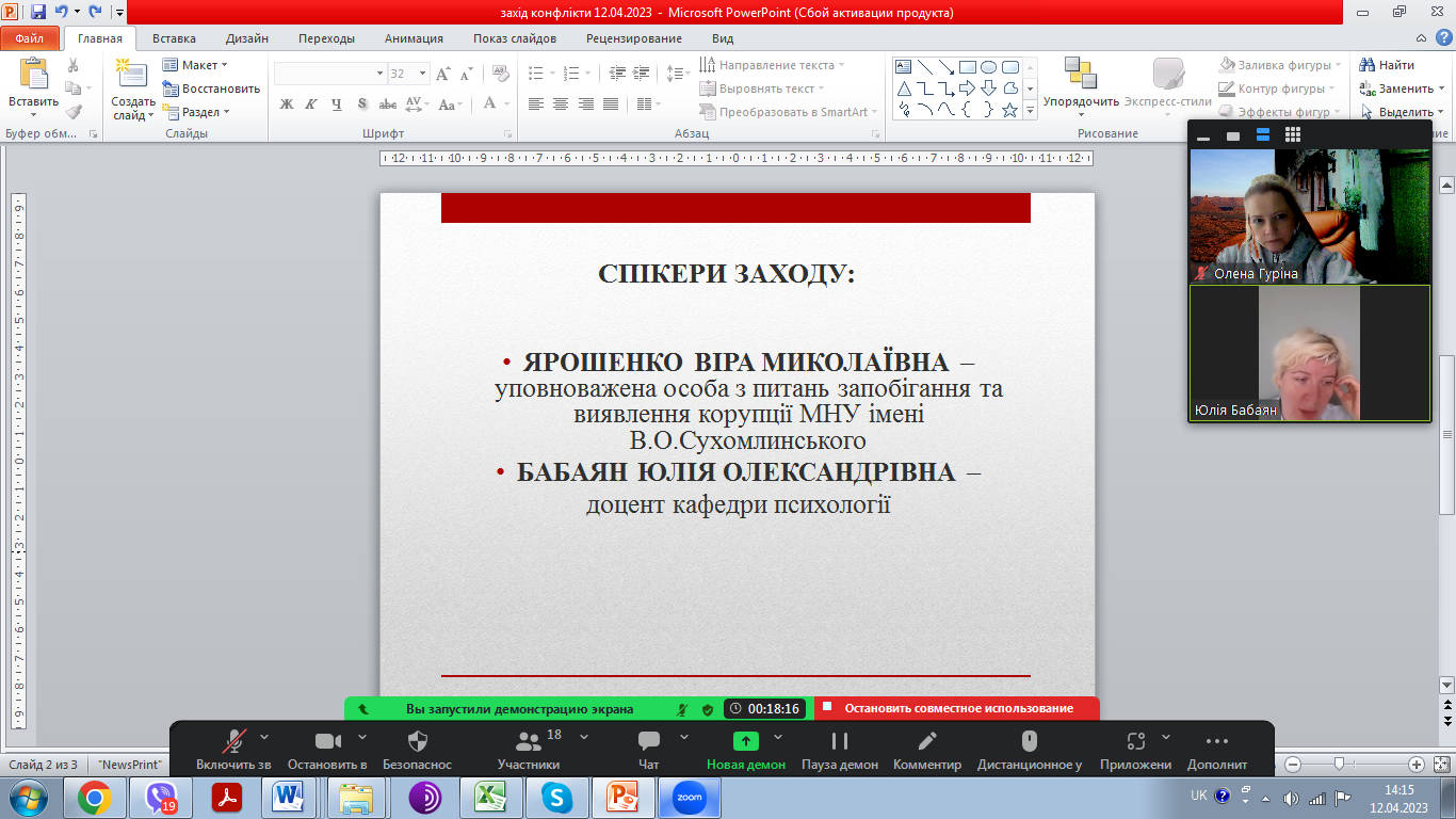 До обговорення питань, пов’язаних із виникненням конфліктів та процедурами їх вирішення була запрошена доцент кафедри психології, кандидат психологічних наук Юлія Бабаян. Питання формування антикорупційної стійкості в українському суспільстві підняла у своїй доповіді уповноважена особа з питань запобігання та виявлення корупції, доцент, кандидат політичних наук Віра Ярошенко. Спікери і учасники зустрічі разом відпрацювали кейси щодо правильної поведінки та поводження під час виникнення конфліктів, обговорили до яких осіб (працівників університету) і при яких обставинах слід звертатися по допомогу. Усі присутні під час зустрічі отримали актуальну та корисну інформацію, мали можливість поставити питання та отримати змістовну відповідь.