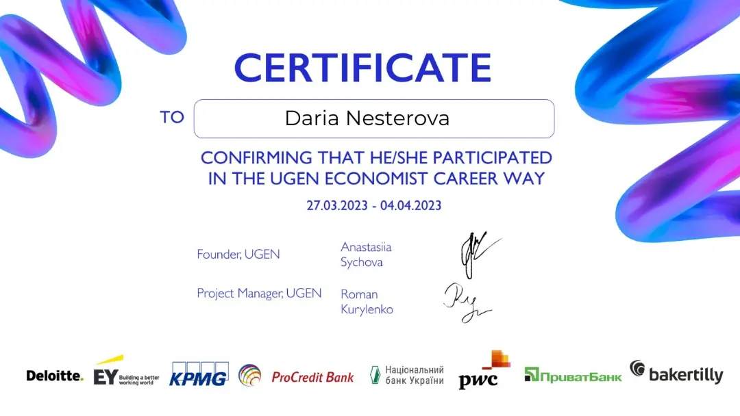 Студенти ІІІ курсу спеціальності 072 «Фінанси, банківська справа та страхування» Нестерова Дар’я, Сердюкова Олена та Божецька Катерина взяли участь у заходах Economic Career Way, що були анонсовані компанією «UGEN» як серія вебінарів для майбутніх економістів. У рамках проекту проводилися тренінги та вебінари від таких компаній: «KPMG», «ProCredit Bank», «Deloitte», «Baker Tilly» «PwC» т. і.