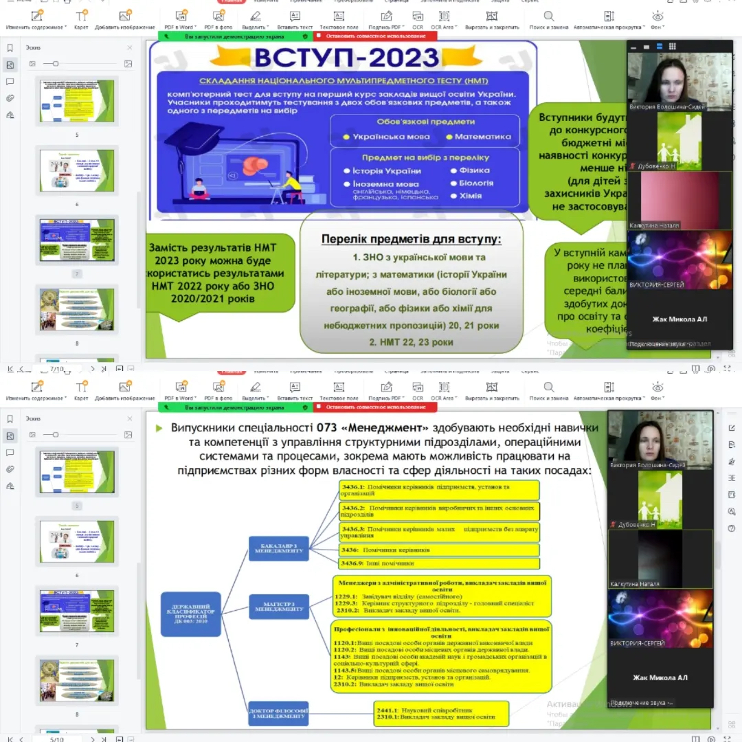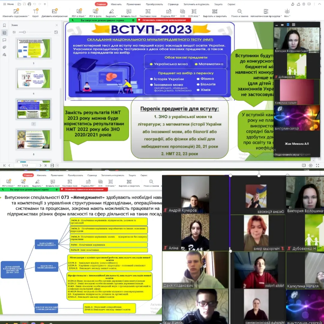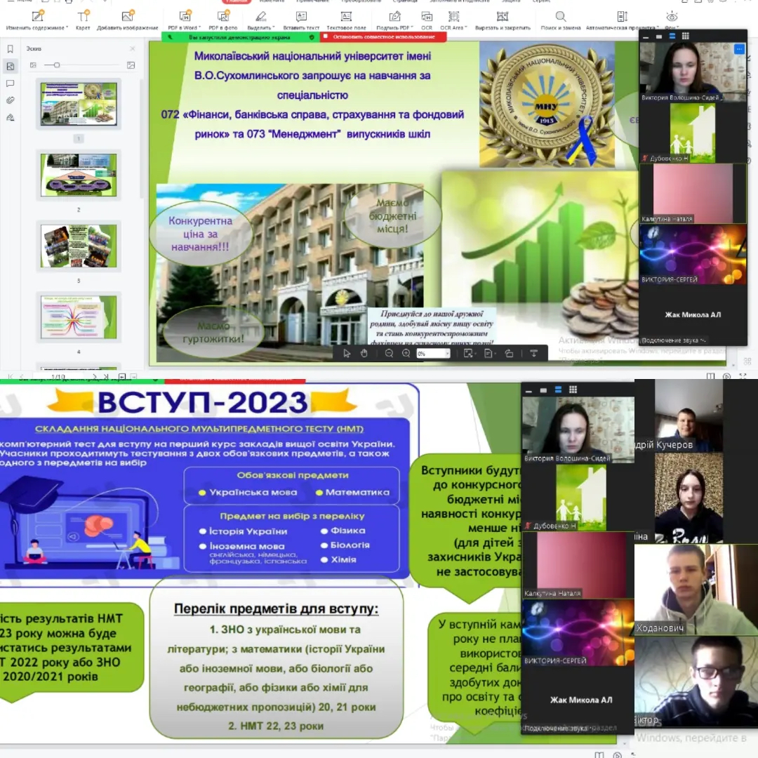 Викладач кафедри економіки, менеджменту та фінансів В. В. Волошина-Сідей провела онлайн-зустріч зі здобувачами освіти Анатолівського ліцею Коблівської ОТГ та Краснопільського ліцею Березанської ОТГ з метою ознайомлення з перспективами вступу на спеціальності кафедри. Під час заходу поспілкувалися про умови навчання в МНУ імені В. О. Сухомлинського та обговорили особливості вступу у 2023 році. Крім того, викладач пояснила процедуру реєстрації абітурієнтів на НМТ.