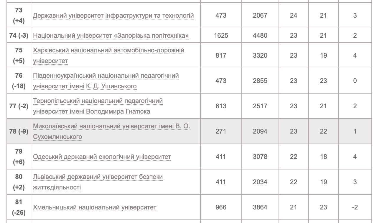 Згідно з результатами рейтингу 2023 року Миколаївський національний університет імені В. О. Сухомлинського займає 78 місце серед закладів вищої освіти.