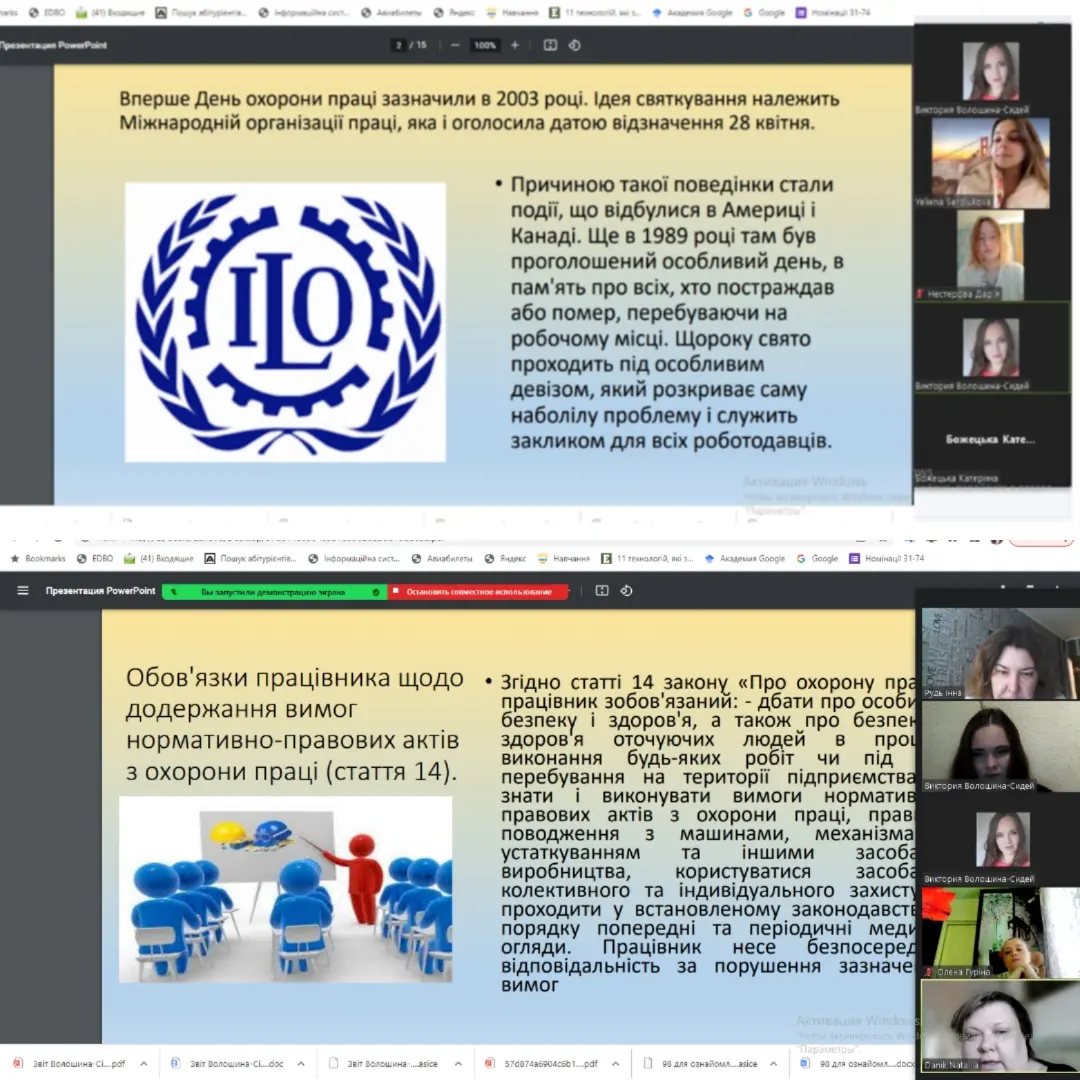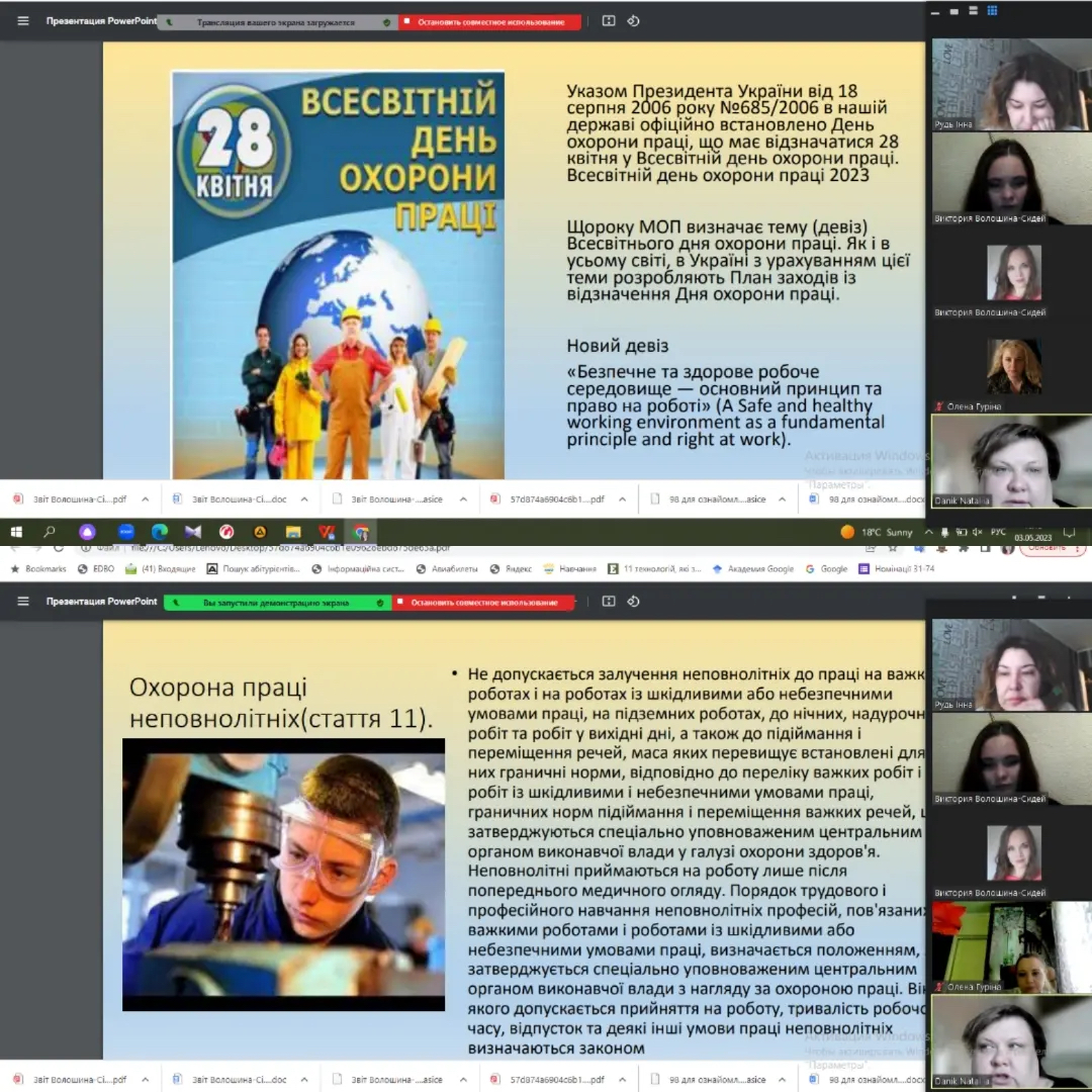 У МНУ імені В. О. Сухомлинського оголошено тиждень, присвячений Дню охорони праці. 3 травня 2023 року викладач кафедри економіки менеджменту та фінансів В. В. Волошина-Сідей провела виховну бесіду зі студентами ІІІ та ІV курсів на тему: «Захист права на безпечне та здорове робоче середовище». Під час заходу поспілкувалися про історію виникнення Всесвiтнього дня охорони працi, що бере початок вiд Дня вшанування пам’ятi працiвникiв, якi загинули на роботi. До бесіди долучилися викладачі кафедри, які розказали про особливості законодавчо-нормативного врегулювання питань охорони праці та закордонний досвід у цьому питанні. Обговорили основні нормативно-правові документи, що врегульовують питання охорони праці. Студентка ІІІ курсу Сердюкова Олена розповіла про діяльність МОП, яка розробляє мiжнароднi трудовi норми у формi конвенцiй i рекомендацiй, що встановлюють мiнiмальнi стандарти основних трудових прав: робочий час, час вiдпочинку, оплата працi, здоровi та безпечнi умови працi, piвнi можливостi чоловiкiв i жiнок.