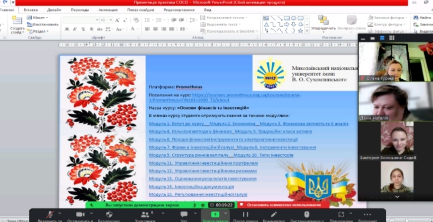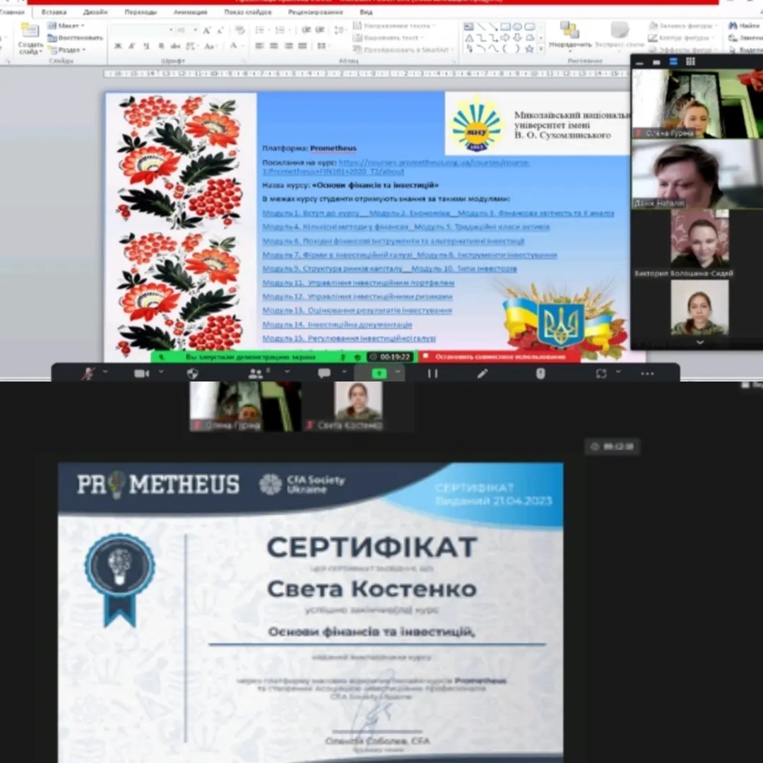 Цього року під час практичної підготовки студенти опановували практичний курс «Основи фінансів та інвестицій» через платформу масових відкритих онлайн курсів Prometheus. В результаті успішного проходження курсу всі здобувачі отримали відповідні сертифікати.