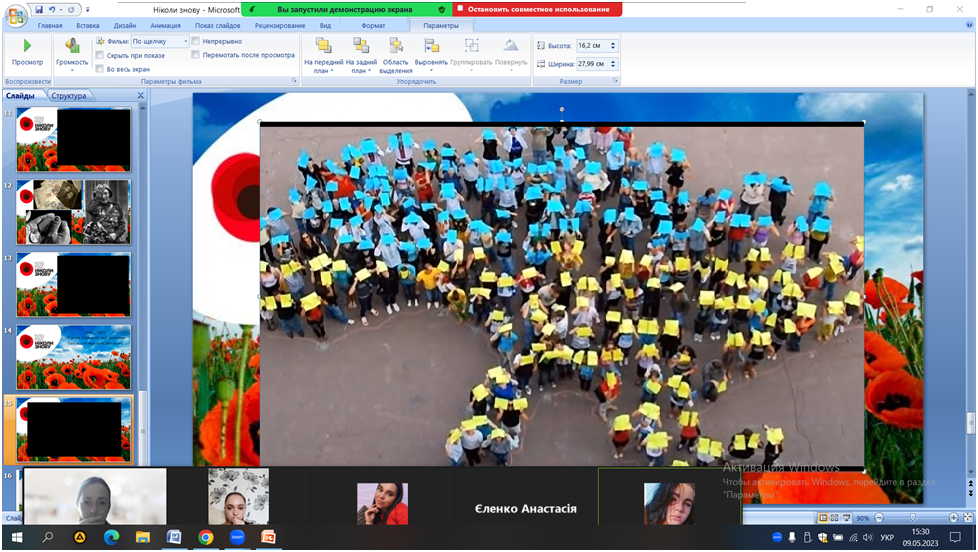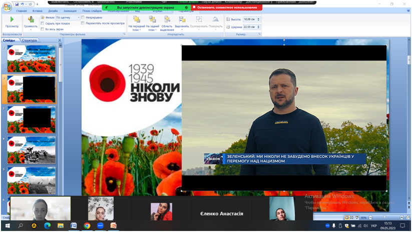 З нагоди вшанування подвигу українського народу, його визначного внеску в перемогу Антигітлерівської коаліції у Другій світовій війні та висловлення поваги всім борцям проти нацизму кандидат педагогічних наук, старший викладач кафедри початкової та дошкільної освіти Т. В. Філімонова спільно зі студентами І курсу спеціальності 013 «Початкова освіта» проведено виховний захід «Ми пам’ятаємо! Ніколи знову».