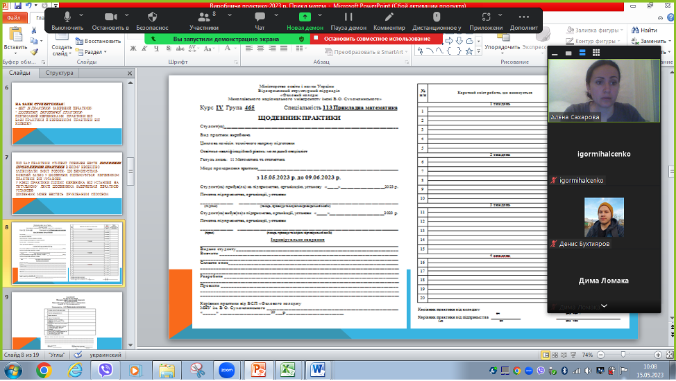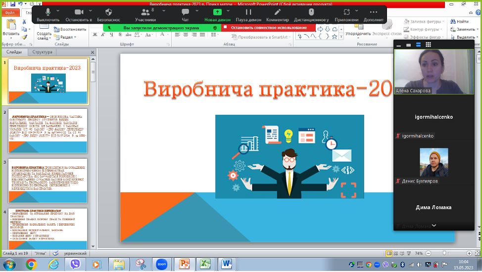 Під час зустрічі керівник практики І. В. Михальченко та заступник директора з навчальної роботи О. М. Сахарова ознайомили присутніх із завданнями практики, переліком звітної документації, формою звітності, датою проведення підсумкової конференції та формою контролю, проінформували здобувачів фахової передвищої освіти з питань нормативно-правового забезпечення практики, провели інструктаж з техніки безпеки та охорони праці з урахуванням дистанційного навчання.