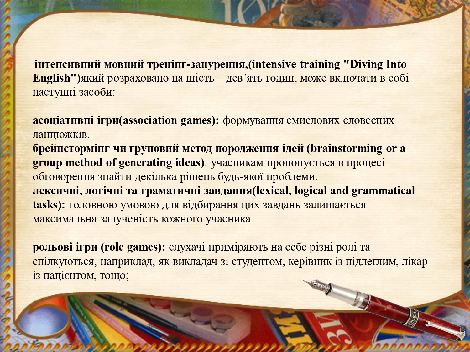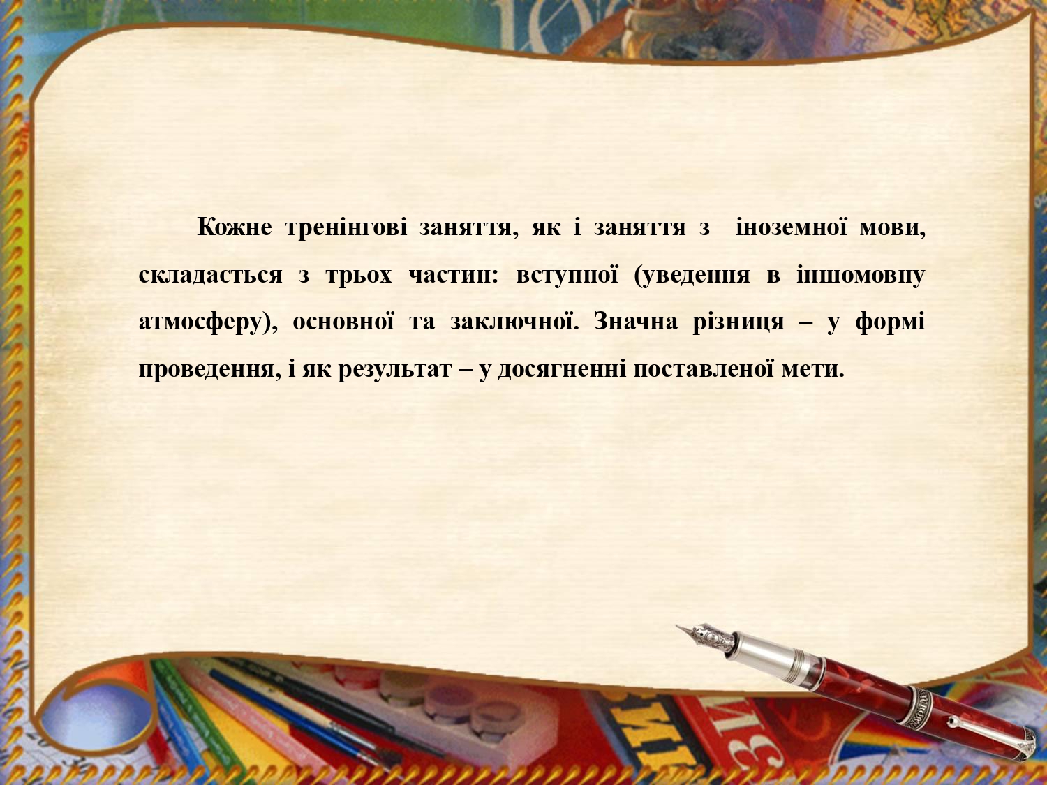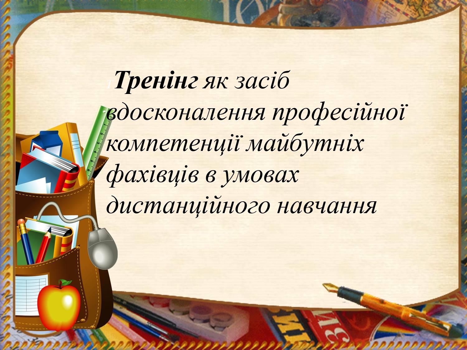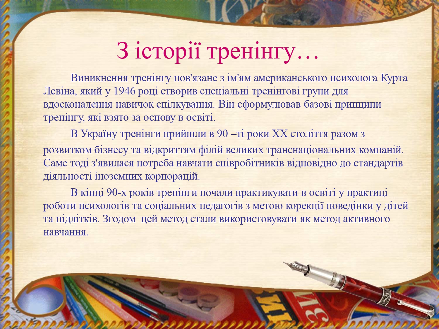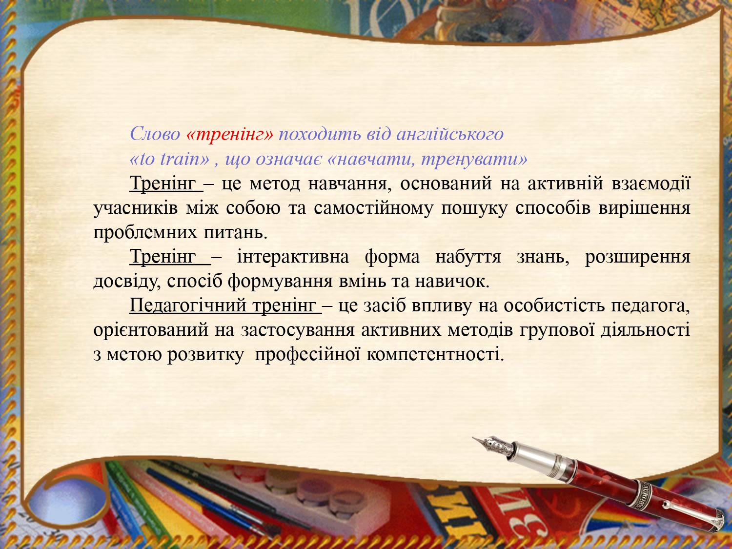 Актуальність презентації викладача висвітлює найважливіші завдання педагогічної освіти та розвиток особистісних потенційних характеристик педагога, освоєння та вдосконалення ним професійних та інноваційних технологій. Автор акцентує увагу на розкритті змісту поняття «тренінг». Метою є обґрунтування даного методу навчання та його практичне впровадження в освітній процес.