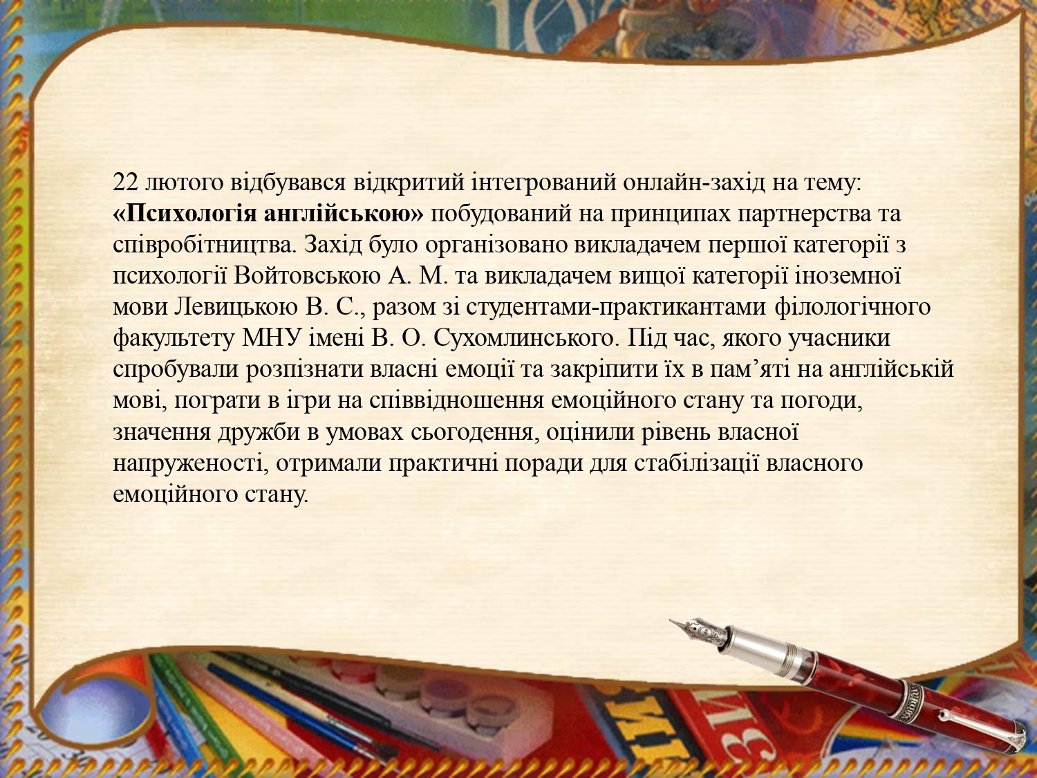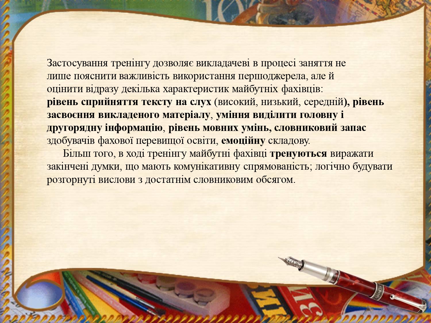 З метою вивчення та впровадження в роботу такого інноваційного методу роботи як тренінг, викладач вищої категорії ВСП «Фаховий коледж МНУ імені В. О. Сухомлинського» Вікторія Левицька пройшла курси підвищення кваліфікації у Вищому навчальному закладі Укоопспілки «Полтавський університет економіки і торгівлі» за програмою «Тренінгові технології в навчанні». Оволодіння новими технологіями навчання й виховання вимагає внутрішньої готовності викладача до розуміння необхідності освіти протягом всього життя, серйозної діяльності щодо запровадження нових методів навчання та викладання, адаптації до нових умов розвитку суспільства. Перевагами тренінгу є нестандартність форм проведення. Він не схожий на класичні заняття, оскільки головним його завданням є встановлення контакту між здобувачами освіти та викладачем.