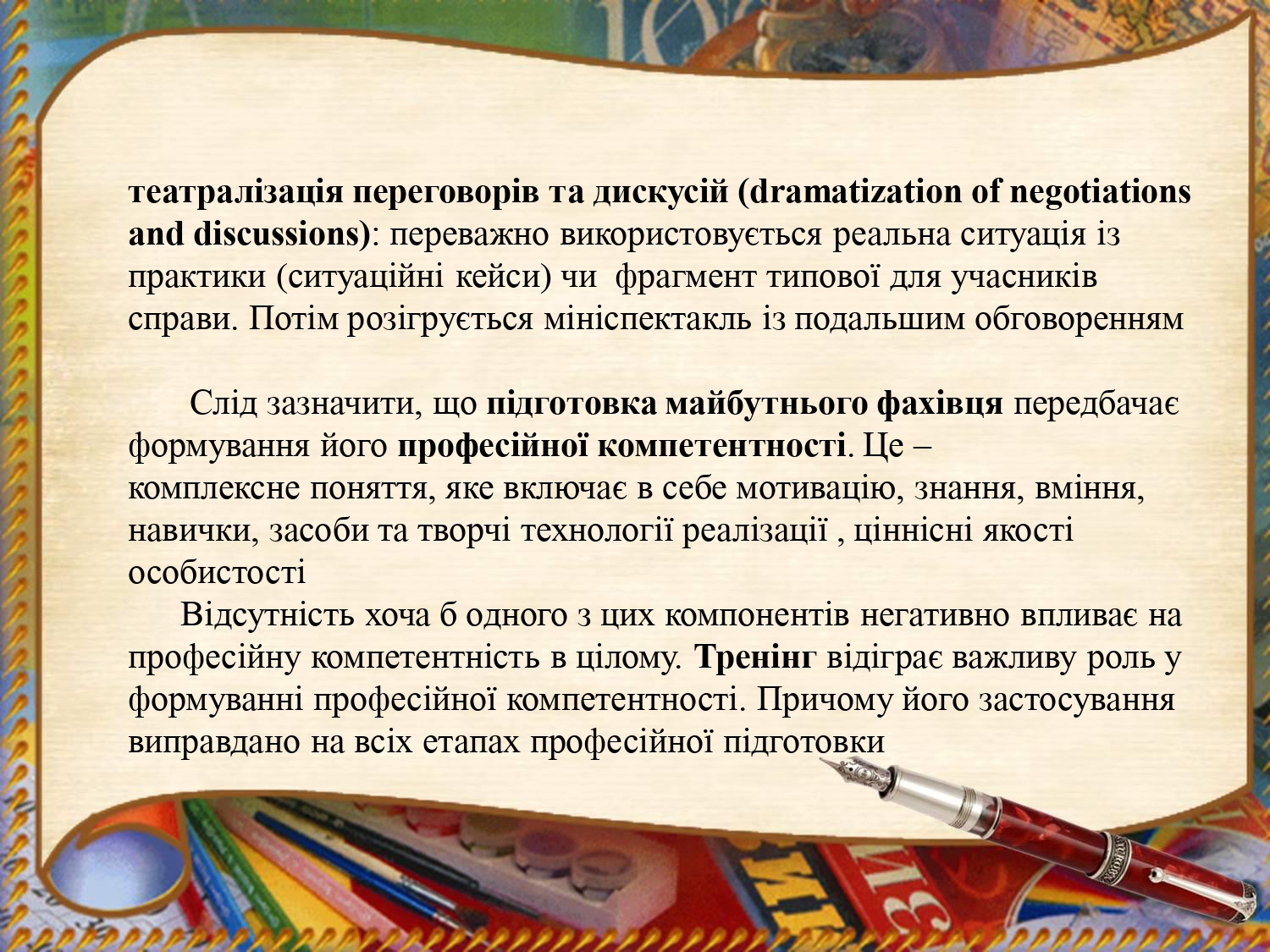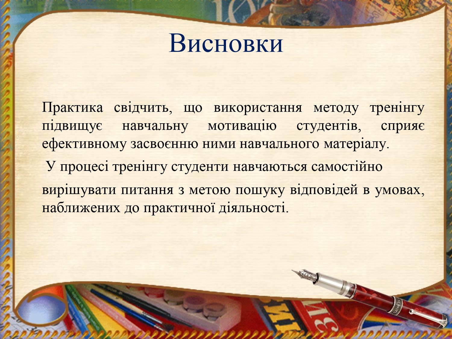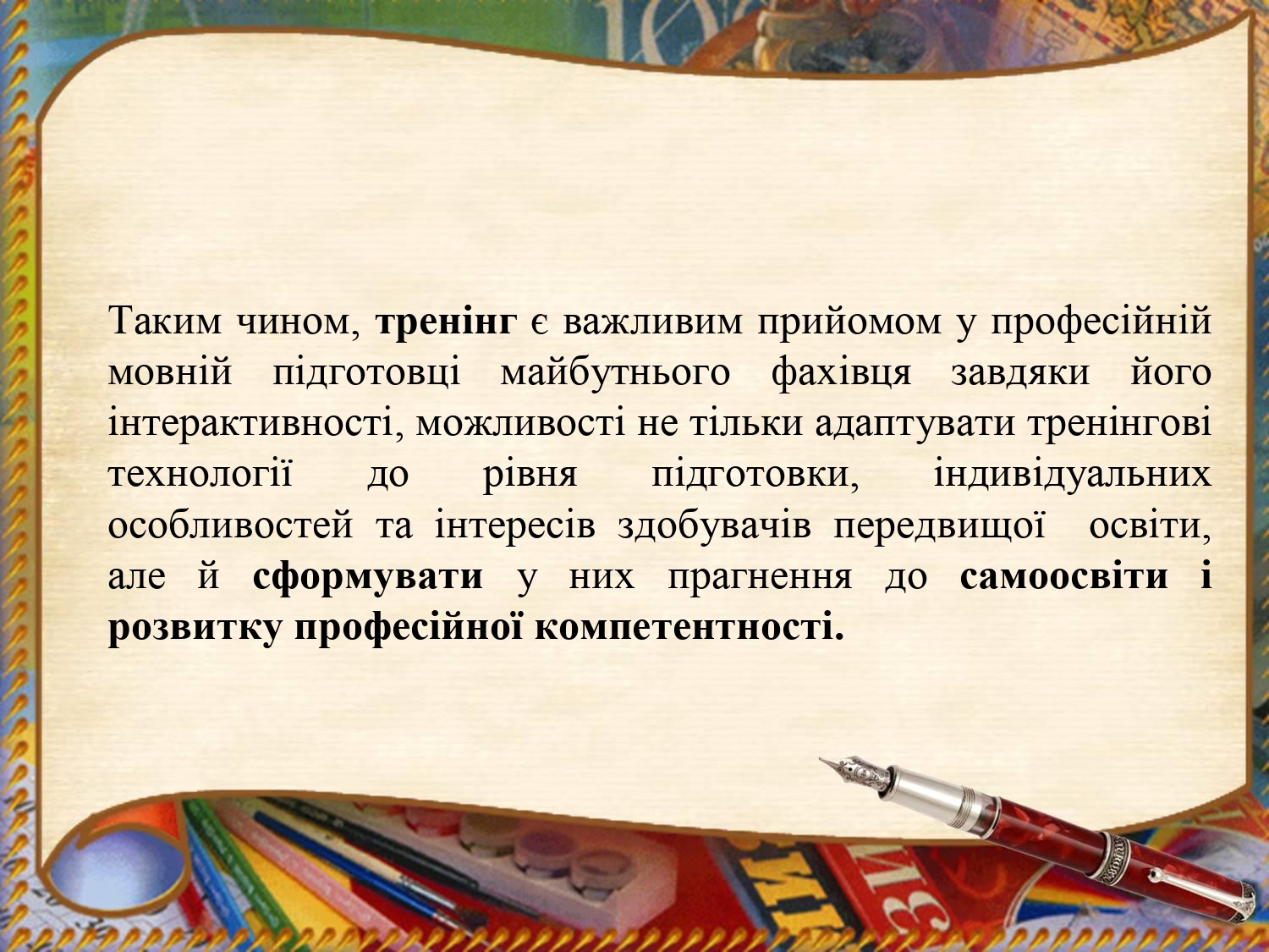 Практика свідчить, що використання методу тренінгу підвищує навчальну мотивацію студентів, сприяє ефективному засвоєнню ними навчального матеріалу. У процесі тренінгу студенти навчаються самостійно вирішувати питання з метою пошуку відповідей в умовах, наближених до практичної діяльності. Таким чином, тренінг є важливим прийомом у професійній мовній підготовці майбутнього фахівця завдяки його інтерактивності, можливості не тільки адаптувати тренінгові технології до рівня підготовки, індивідуальних особливостей та інтересів здобувачів передвищої освіти, але й сформувати у них прагнення до самоосвіти і розвитку професійної компетентності.