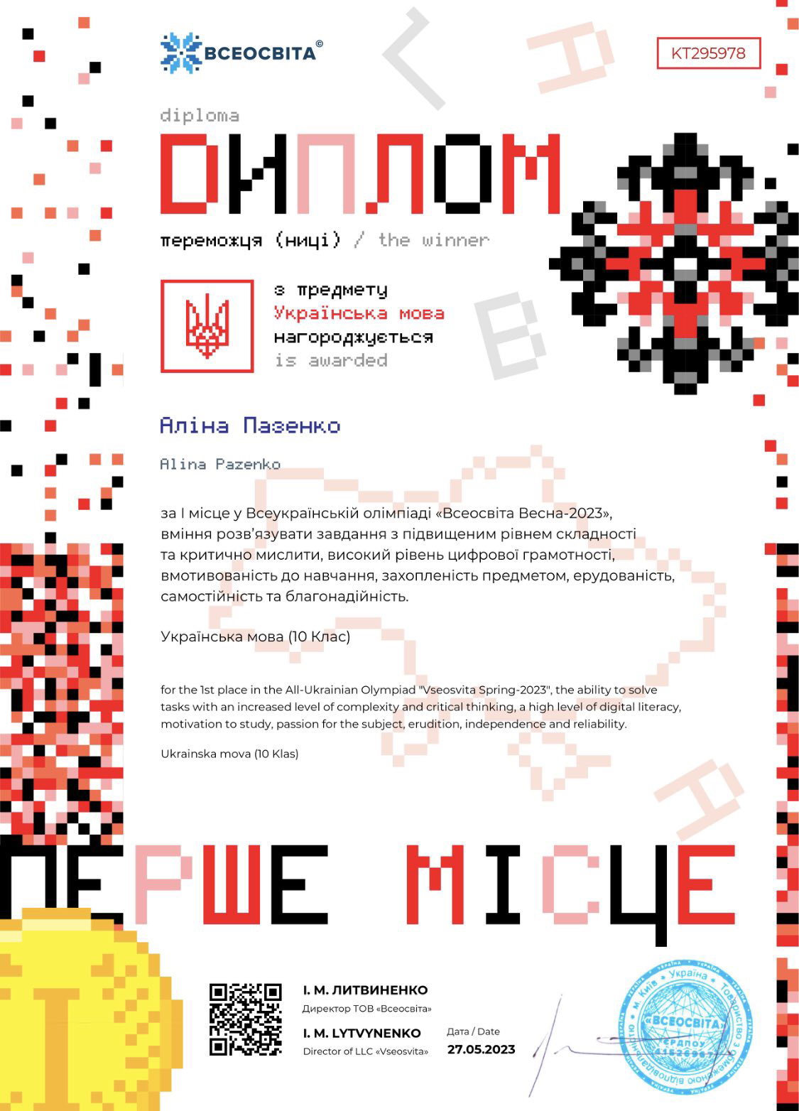 - Пазенко Аліна, 155 група – І місце;