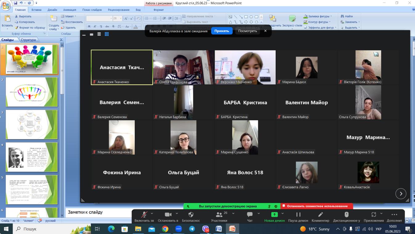 5 червня 2023 року у межах науково-дослідної роботи кафедри початкової та дошкільної освіти «Теоретико-методичні засади формування професійно-педагогічної культури в майбутніх фахівців дошкільної освіти в умовах ЗВО» (науковий керівник – д. пед. н., проф. О. С. Трифонова) проведено круглий стіл «Професійно-мовленнєва культура майбутнього педагога: виклик сучасності». Захід об’єднав здобувачів першого (бакалаврського – 218 гр. ДФН) та другого (магістерського) рівня вищої освіти (518 гр. ДФН і ЗФН), роботодавців та науково-педагогічних працівників. Із вступним словом виступила д. пед. н., проф. Олена ТРИФОНОВА.
