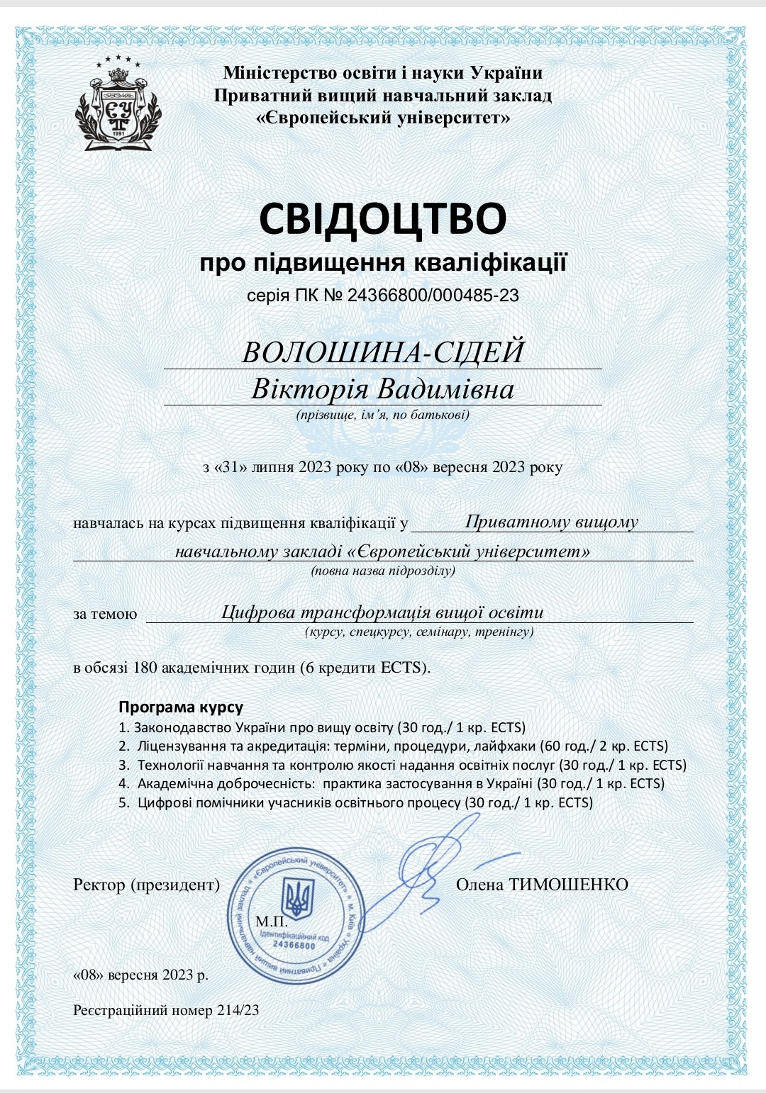 Викладач кафедри економіки, менеджменту та фінансів, к.е.н. Волошина-Сідей Вікторія Вадимівна пройшла курси підвищення кваліфікації “Цифрова трансформація вищої освіти”. Курс був розрахований на 180 годин (6 кредитів ЄКТС) та передбачав опанування слухачами навчального матеріалу, виконання контрольних занять, а також складання підсумкового тестування.