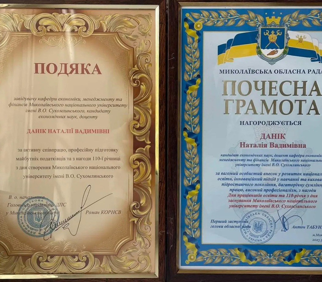 З нагоди професійного свята – Дня працівників освіти, за вагомий внесок у підготовку фахівців й виховання студентської молоді почесними грамотами від Миколаївської обласної ради та департаменту освіти і науки Миколаївської обласної військової адміністрації було нагороджено викладачів кафедри економіки, менеджменту та фінансів: доцента Данік Н.В., доцента Рудь І. Ю., старшого викладача Волошину-Сідей В.В..