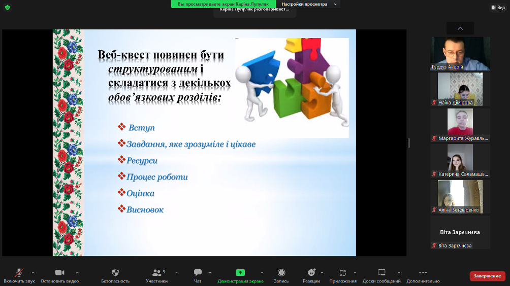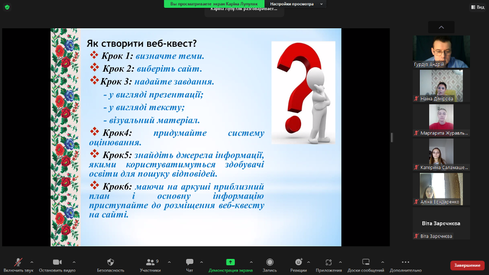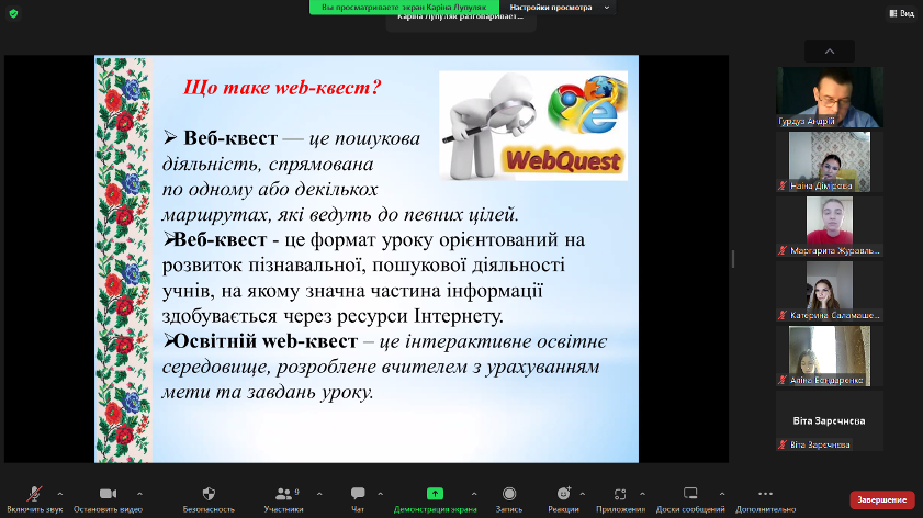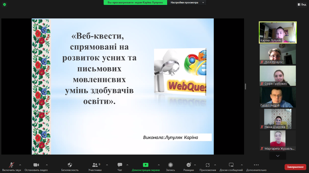 Лупуляк Каріна, студентка ІІ (магістерського) рівня, ознайомила учасників із особливостями використання вебквестів, продемонструвавши програми для створення їх. Студентка довелає, що педагог, який спробує створити хоча б один вебквест на своїх заняттях, відразу побачить позитивні зміни в процесі навчання мови.