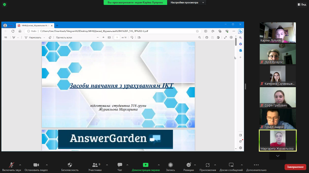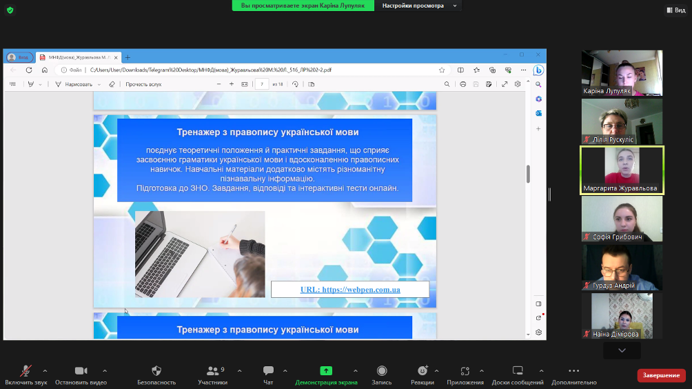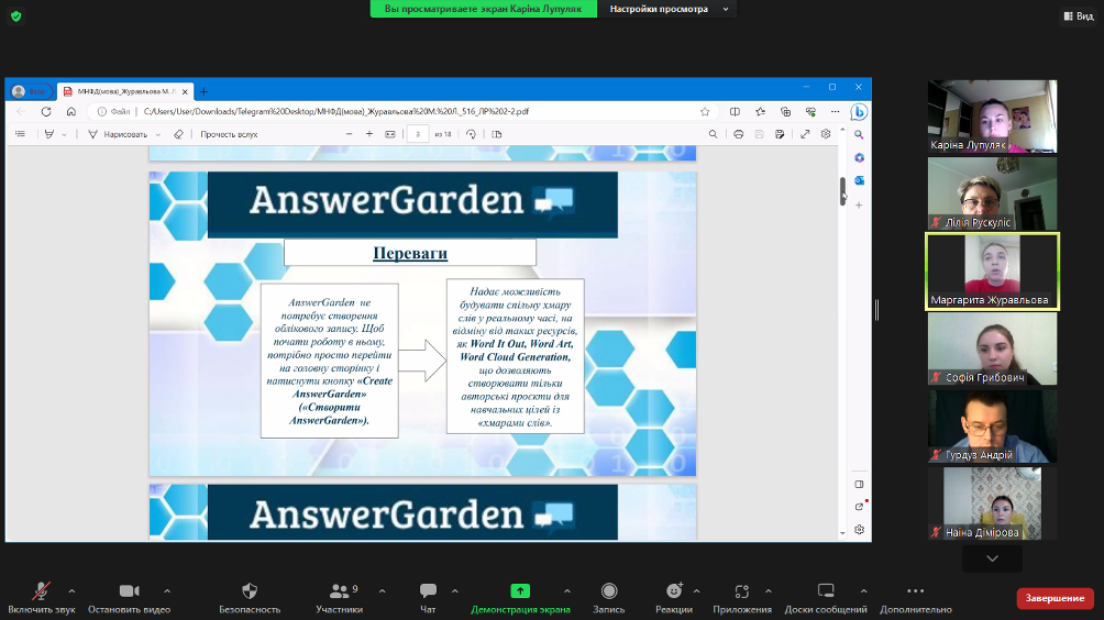 У межах семінарів, присвячених інноваційним технологіям навчання мови і літератури, Журавльова Маргарита, студентка ІІ (магістерського) рівня, продемонструвала приклади різноманітних онлайн-ресурсів, які доцільно використовувати у майбутній професійній діяльності як у школах, так і у ЗВО. Доповідачка висвітлила переваги цих платформ, особливості користування ними.