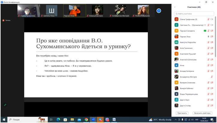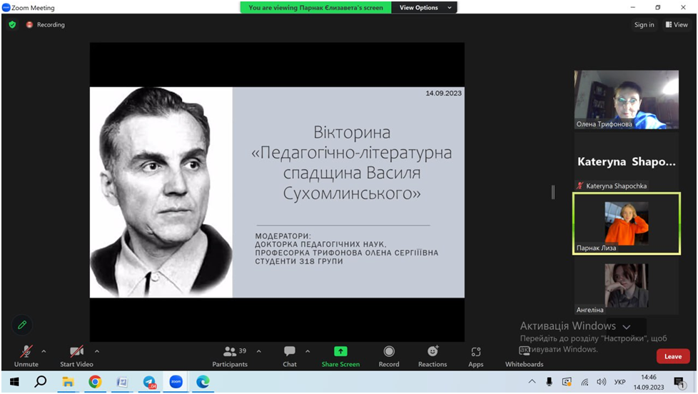 14 вересня 2023 року здобувачі першого (бакалаврського) рівня вищої освіти 318 гр. спеціальності 012 «Дошкільна освіта» (кураторка – проф. О.Трифонова) провели вікторину «Педагогічно-літературна спадщина В. О. Сухомлинського», що виступила своєрідним підсумком проведених заходів із нагоди 105-річниці Дня народження Василя Олександровича Сухомлинського, ініційованих кафедрою початкової та дошкільної освіти.