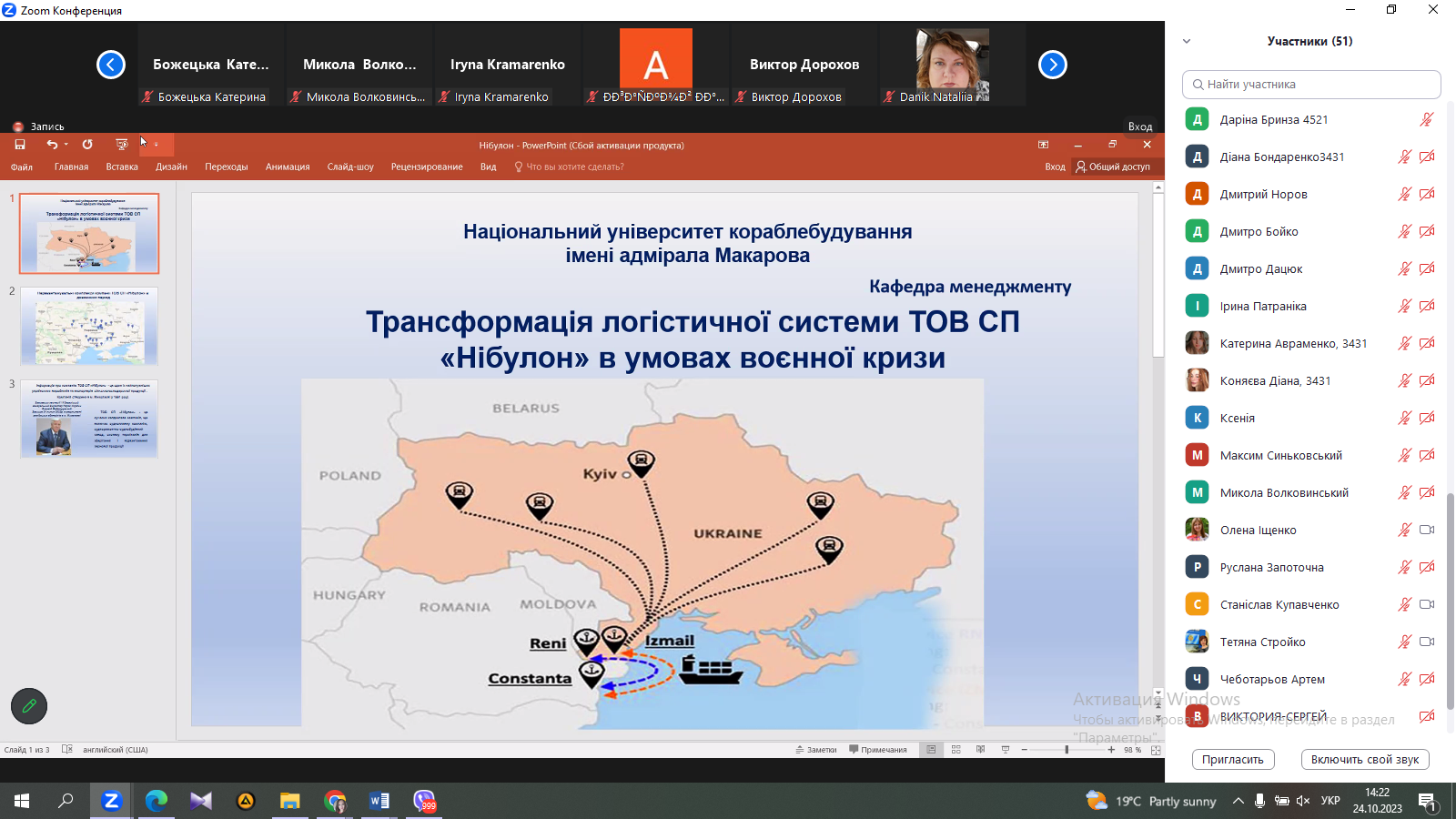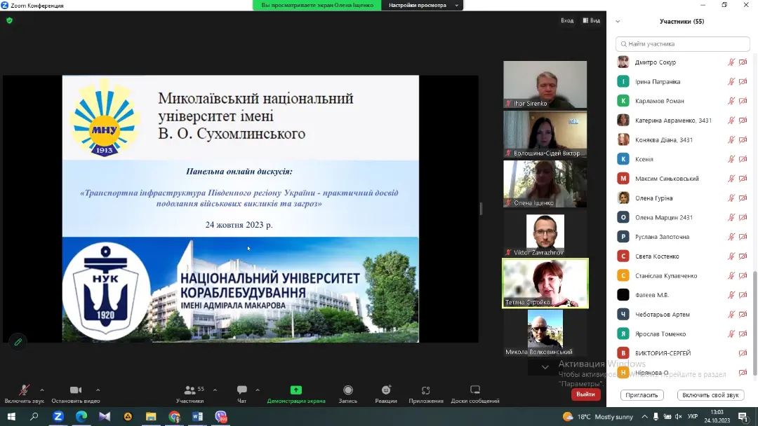 24 жовтня 2023 року кафедрою економіки, менеджменту та фінансів Миколаївського національного університету імені В.О. Сухомлинського та кафедрою менеджменту Національного університету кораблебудування імені адмірала Макарова було проведено панельну дискусію «Транспортна інфраструктура Південного регіону України – практичний досвід подолання військових викликів та загроз».