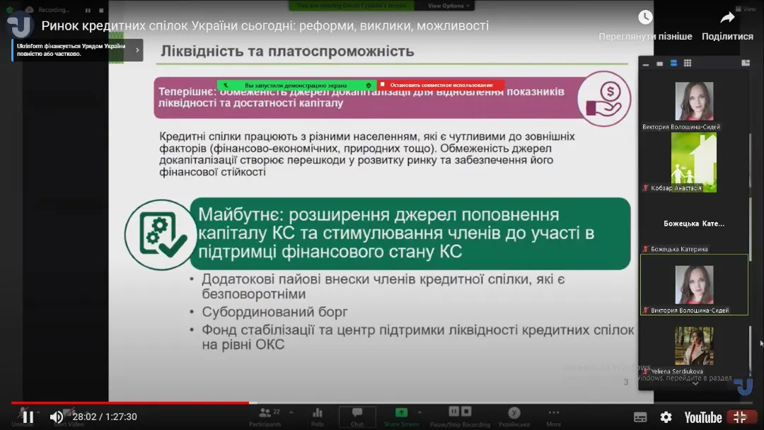 Учасники обговорили закон України «Про кредитні спілки», очікування ринку щодо нового регулювання і сучасні тенденції розвитку кредитних спілок України. Також на заході було висвітлено погляди на підтримку українських кредитних спілок від Агентства США з міжнародного розвитку (USAID) і Всесвітньої ради кредитних спілок, включаючи огляд технічної допомоги за Проєктом USAID «Кредитування сільськогосподарських виробників (КЕП)».