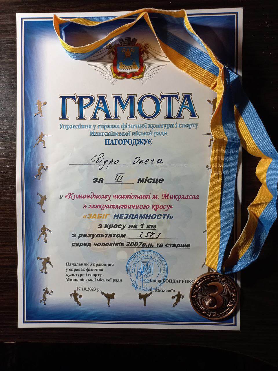 Один із них, студент 2-го курсу Свідро Олег зайняв почесне 3-тє місце, на дистанції 1 км, з часом 3.57.3, серед чоловіків 2007 р. та старше.