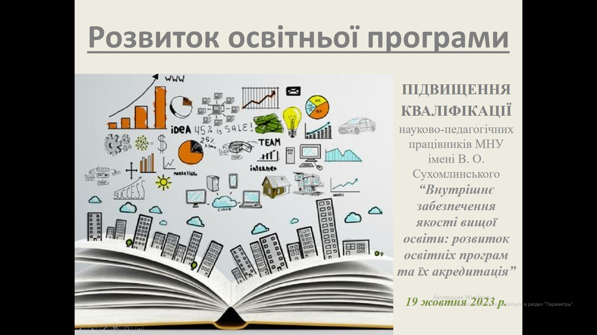 З метою професійного розвитку педагогічних і науково-педагогічних працівників, відповідно до державної політики у галузі освіти та забезпечення якості освіти, на виконання наказу № 289 «Про навчання за програмами підвищення кваліфікації педагогічних і науково-педагогічних працівників» в МНУ імені В. О. Сухомлинського 19.10.2023р. продовжили навчання за програмою підвищення кваліфікації на тему «Розвиток освітніх програм» (доповідач – Н. В. Данік, кандидат економічних наук, доцент, в.о. завідувача кафедри економіки, менеджменту та фінансів).