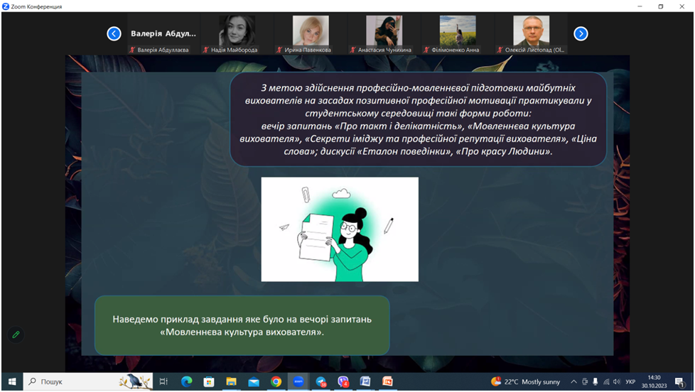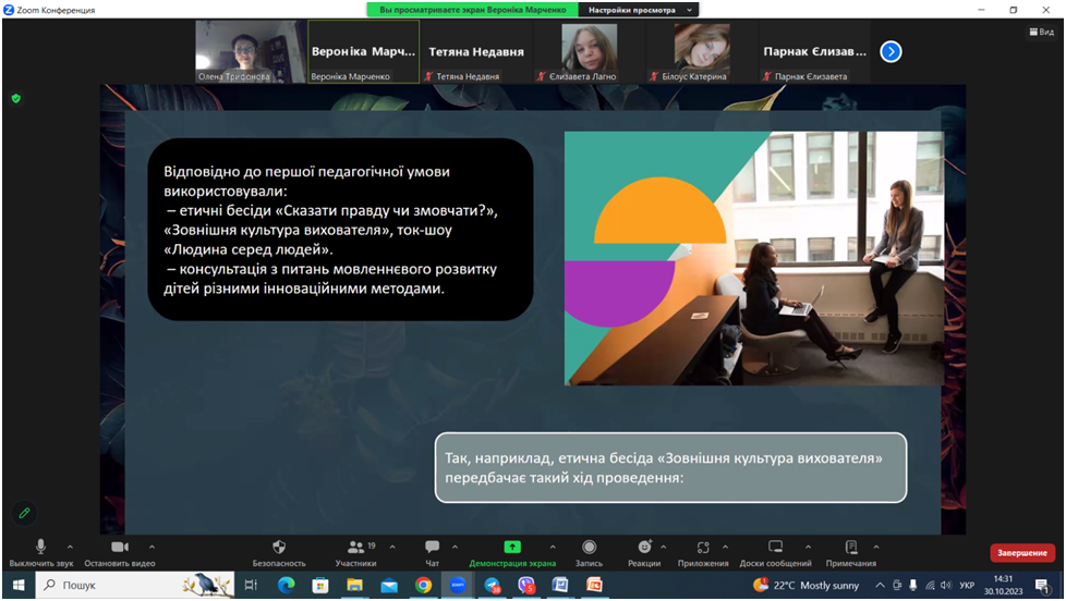 У виступі Вероніки Марченко йшлося про інноваційні технології у формуванні професійно-мовленнєвої готовності майбутніх вихователів дошкільної освіти. Під час дискусії всі учасники обмінювалися думками, зокрема й щодо онлайн-комунікацій, стратегій професійної поведінки педагога в умовах дистанційного навчання.