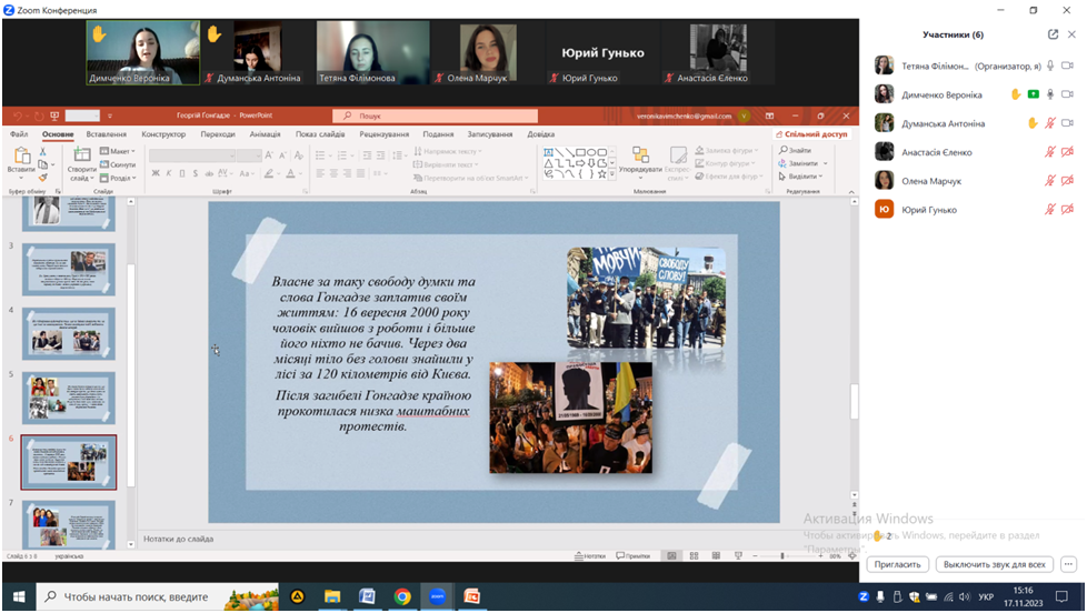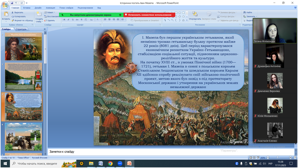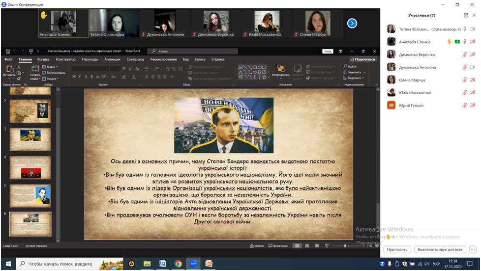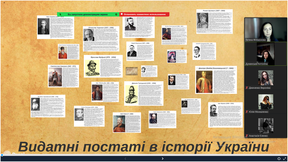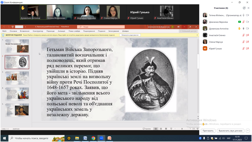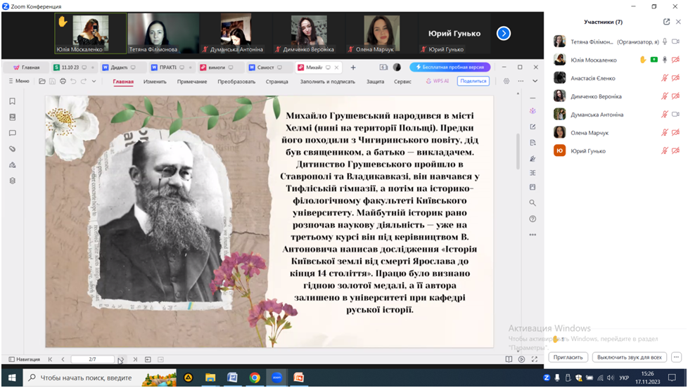 17 листопада 2023 року к.пед.н., ст.викладач кафедри початкової та дошкільної освіти Т.В. Філімонова спільно зі студентами ІІ курсу спеціальності 013 Початкова освіта провела круглий стіл «Видатні постаті української історії».
