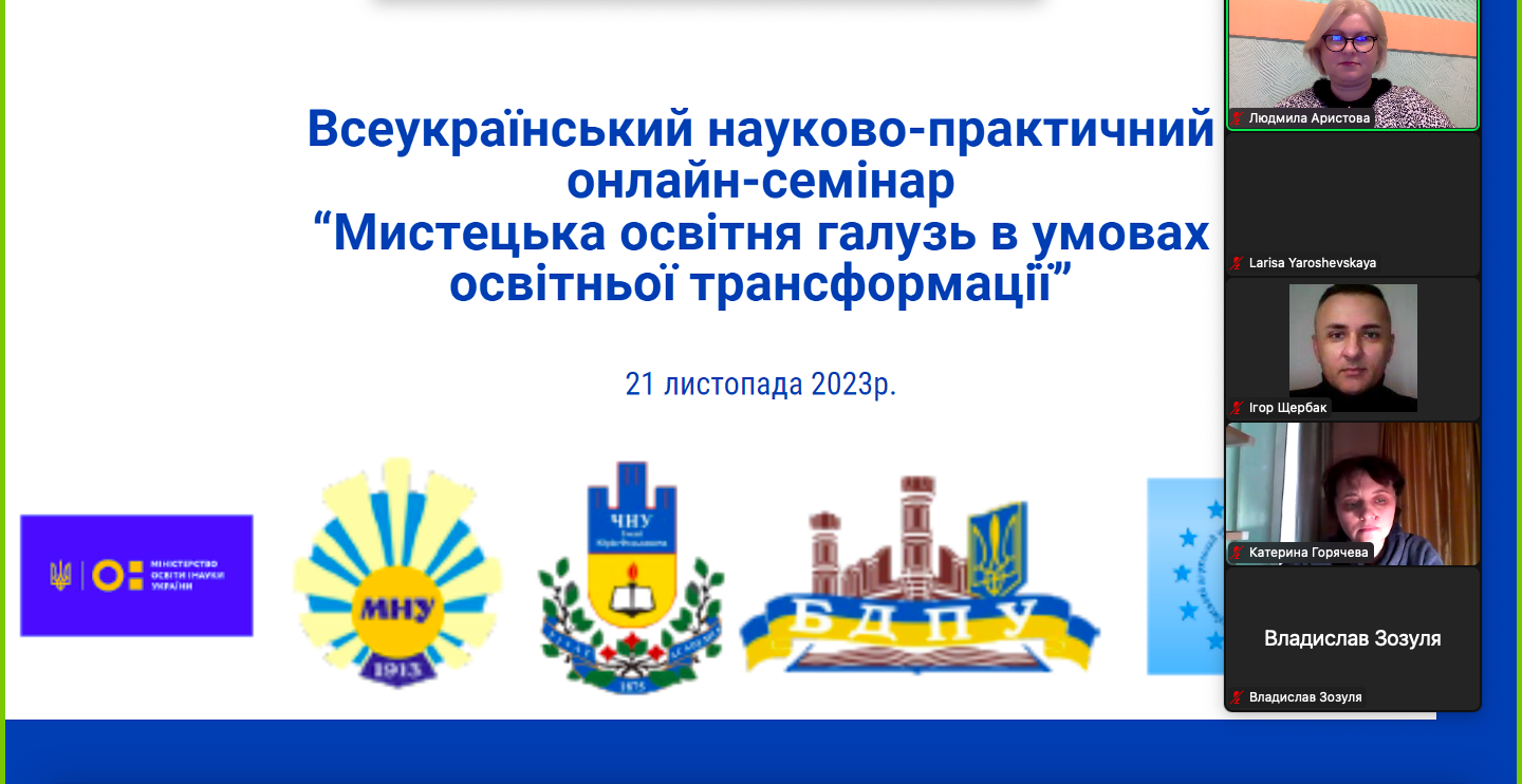 21 листопада 2023 року, у День Гідності і Свободи, розпочав свою роботу Всеукраїнський науково-практичний онлайн-семінар «Мистецька освітня галузь в умовах освітньої трансформації». Організатори семінару викладачі кафедри музичного мистецтва Миколаївського національного університету імені В.О. Сухомлинського.