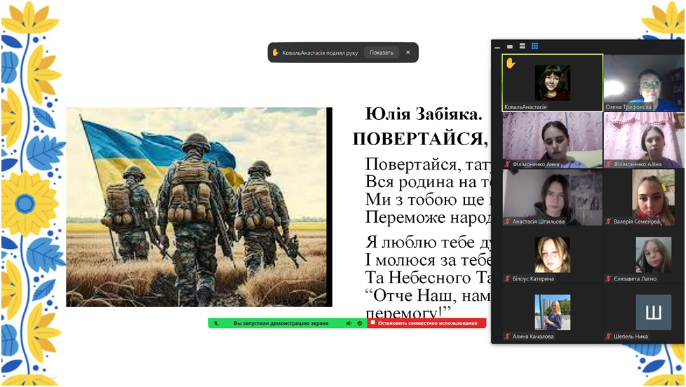 На початку заходу вшанували пам’ять загиблих воїнів хвилиною мовчання. Студенти розповіли про своїх батьків, братів, родичів – військовослужбовців, які мужньо захищають країну, боронять її кордони. Декламували вірші Валентина Северинюка «Збройні Сили України», Тетяни Строкач «Щира подяка вам, наші Герої!», Юлії Забіяки «Молитва за перемогу України», «Повертайся, татусю…», Віри Юрчишин «З перемогою вернись!» та ін.), у яких возвеличується героїзм української армії, їхній бойовий дух, самовіддане служіння Вітчизні.