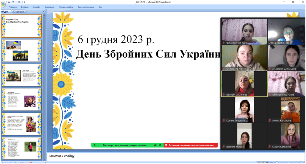 6 грудня 2023 р. з нагоди Дня Збройних Сил України здобувачі першого (бакалаврського) рівня вищої освіти 318 гр. на кураторській годині (д. пед. н., проф. О. С. Трифонова) пригадали історію створення цього державного свята, що відзначається для вшанування та відзначення здобутків і внеску Збройних Сил України у забезпечення національної безпеки та оборони української держави.