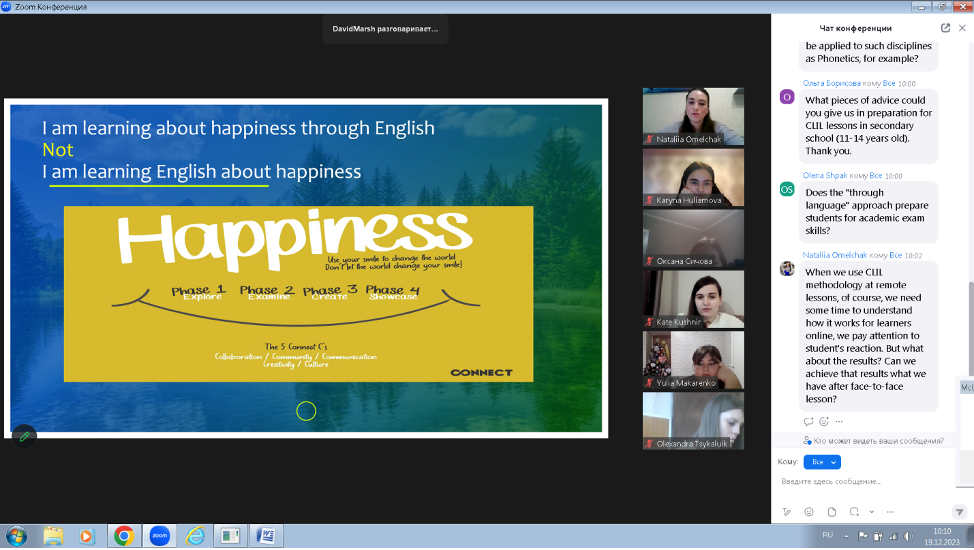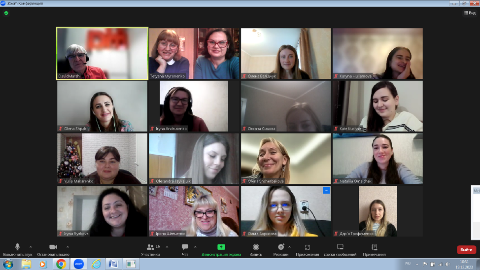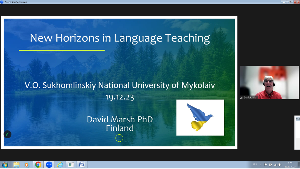 19 грудня 2023 року відбувся другий міжнародний методичний семінар, організований викладачами кафедри германської філології Тетяною Мироненко, Лесею Добровольською, Іриною Шевченко, Оленою Щербаковою та з вчителями англійської мови міста Миколаїв та області із засновником предметно-мовного інтегрованого навчання (CLIL) Девідом Маршем.