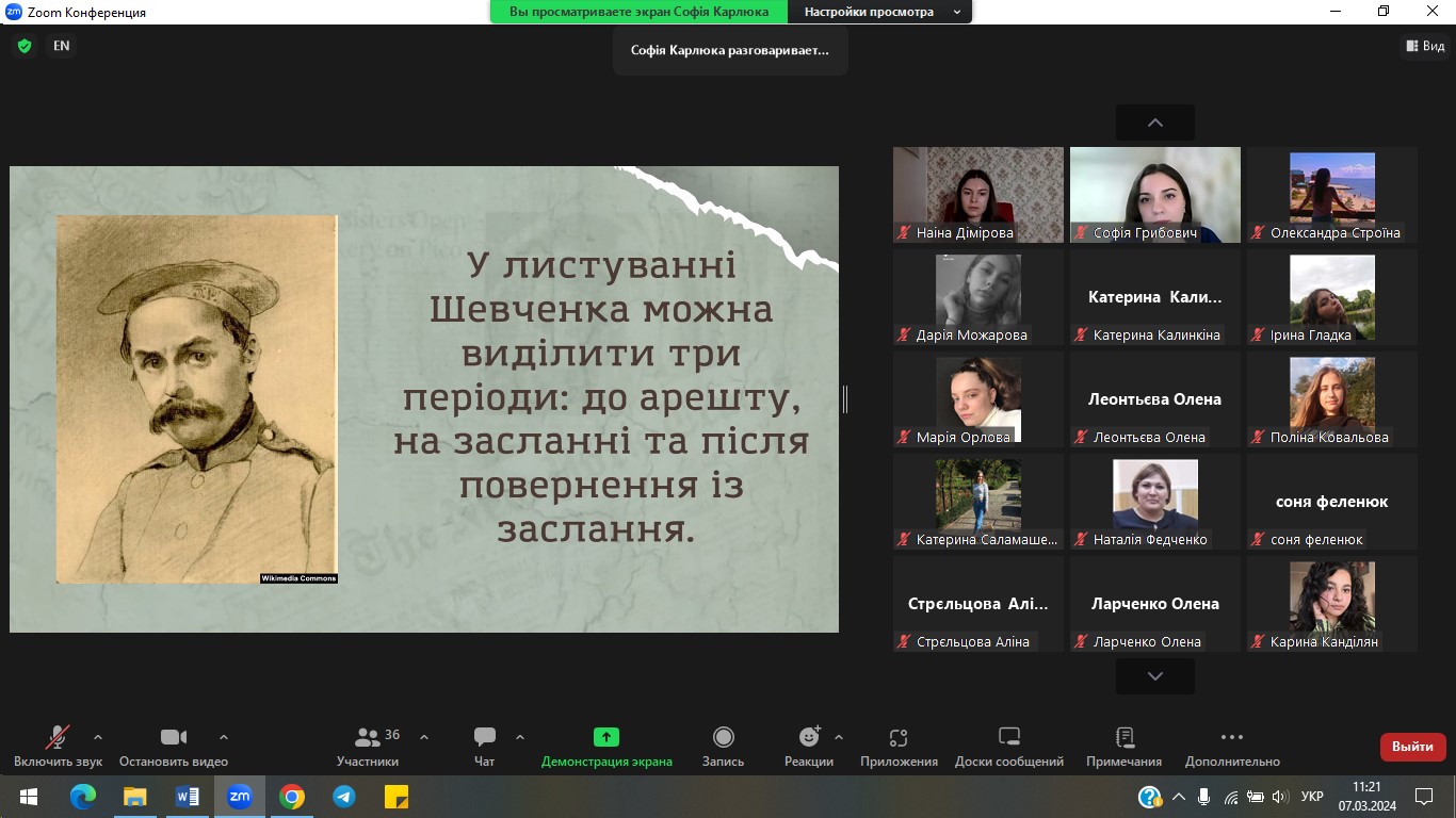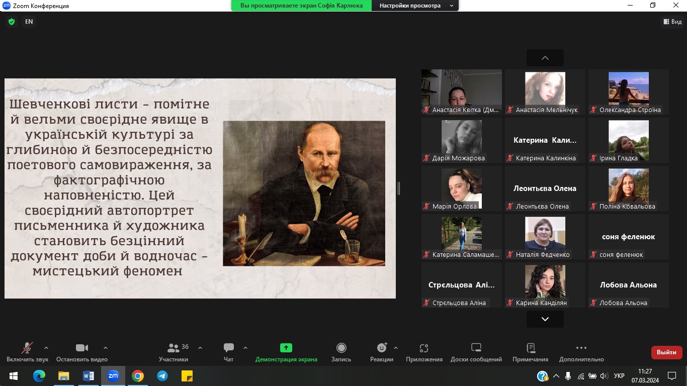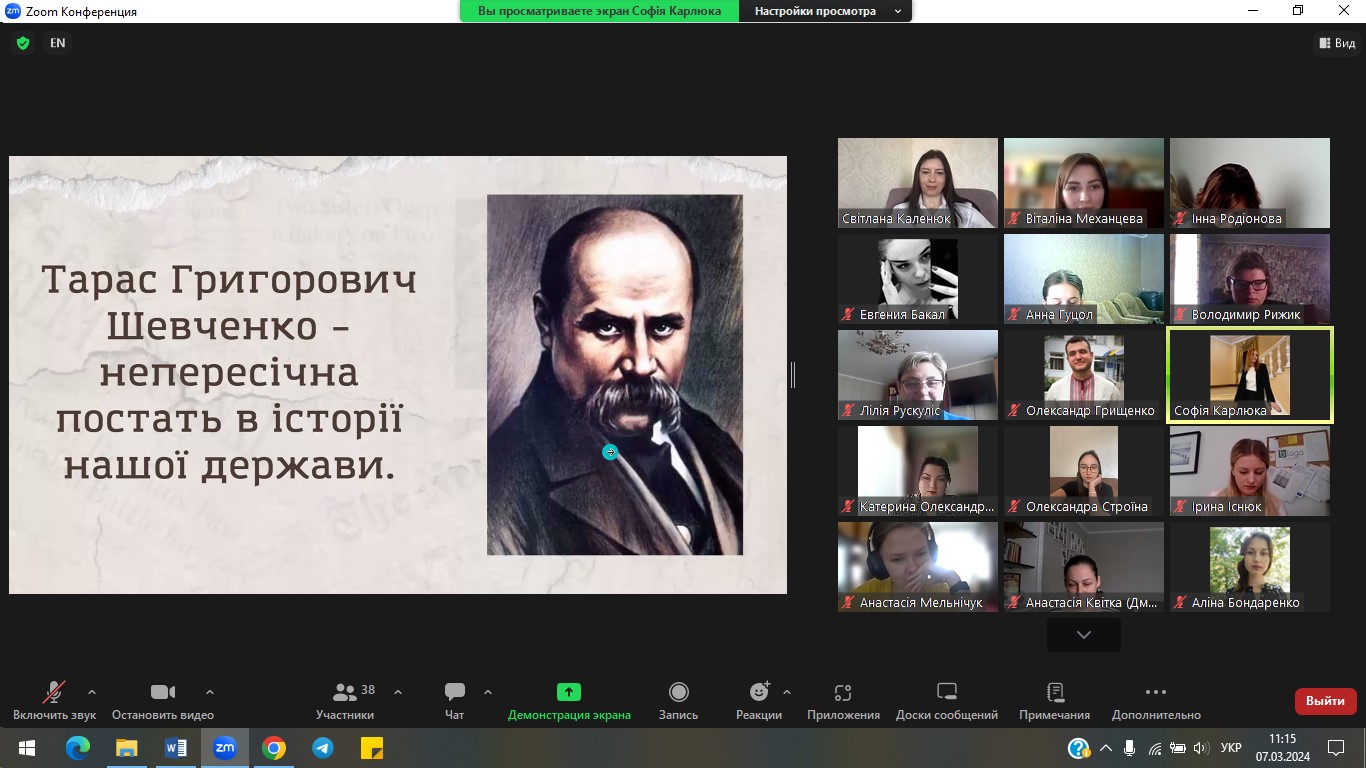 7 березня 2024 р. з ініціативи кафедри української мови і літератури на філологічному факультеті проведено Всеукраїнську студентську науково-практичну конференцію «ТАРАС ШЕВЧЕНКО І ВИКЛИКИ СЬОГОДЕННЯ: ПОСТАТЬ, РЕЦЕПЦІЯ, РОЛЬ». Конференція присвячена 210-річчю з дня народження Великого Кобзаря та покликана окреслити й концептуалізувати стратегії актуальних досліджень його творчості в широкому літературно-мистецькому й соціокультурному контекстах, охоплюючи світову рецепцію, а також осмислення крізь імперативи митця викликів сьогодення. Учасники обговорили актуальні проблеми лінгвістичного, літературознавчого й методичного спектру досліджень творчості Т. Шевченка.