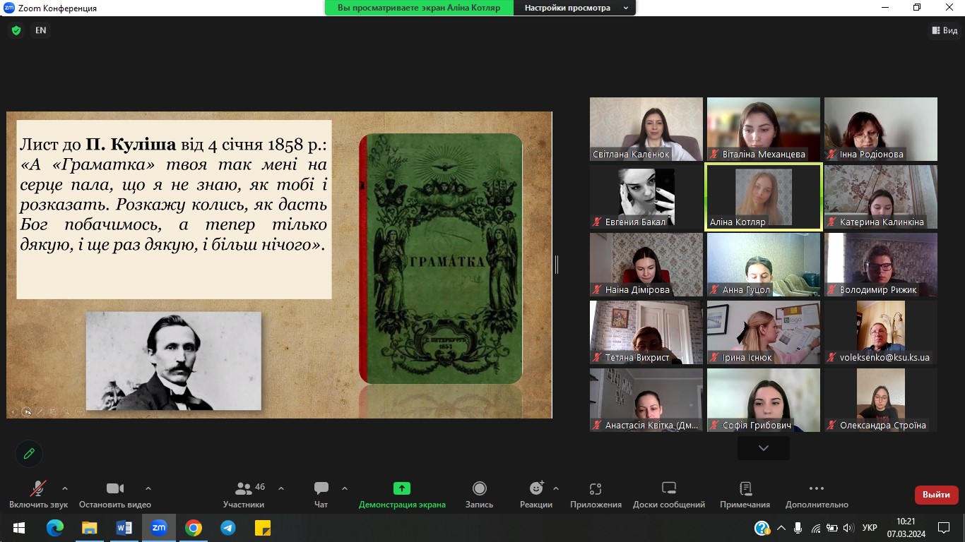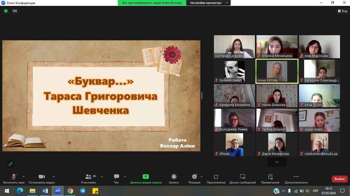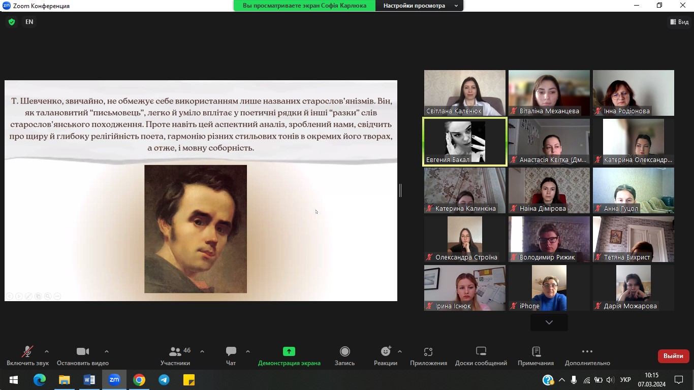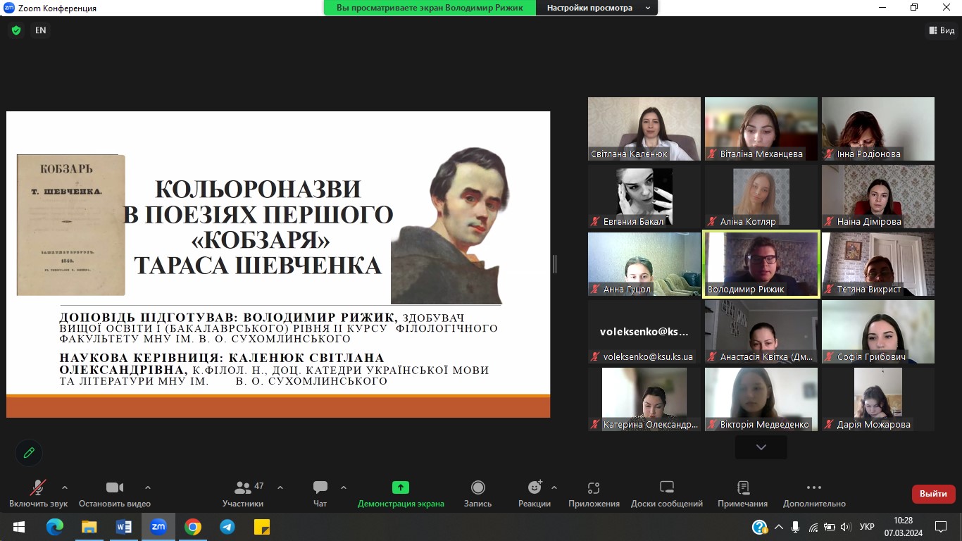 7 березня 2024 р. з ініціативи кафедри української мови і літератури на філологічному факультеті проведено Всеукраїнську студентську науково-практичну конференцію «ТАРАС ШЕВЧЕНКО І ВИКЛИКИ СЬОГОДЕННЯ: ПОСТАТЬ, РЕЦЕПЦІЯ, РОЛЬ». Конференція присвячена 210-річчю з дня народження Великого Кобзаря та покликана окреслити й концептуалізувати стратегії актуальних досліджень його творчості в широкому літературно-мистецькому й соціокультурному контекстах, охоплюючи світову рецепцію, а також осмислення крізь імперативи митця викликів сьогодення. Учасники обговорили актуальні проблеми лінгвістичного, літературознавчого й методичного спектру досліджень творчості Т. Шевченка.