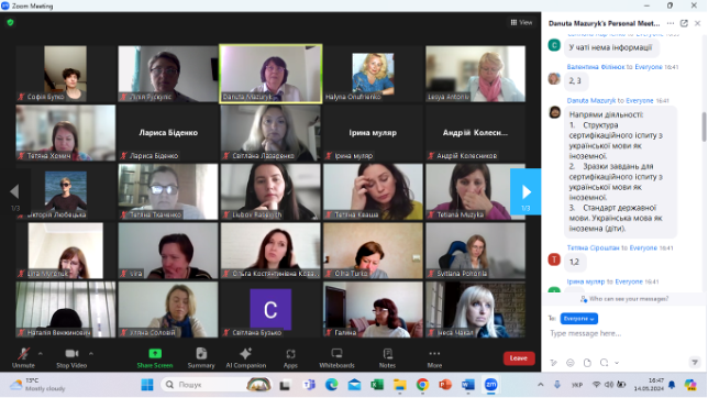 До зустрічі доєдналися 67 учасників із ЗВО Україні, які будуть розподілені на три робочих групи для реалізації векторних цілей Комісії (структура сертифікаційного іспиту з української мови як іноземної; зразки завдань для сертифікаційного іспиту з української мови як іноземної; Стандарт державної мови. Українська мова).